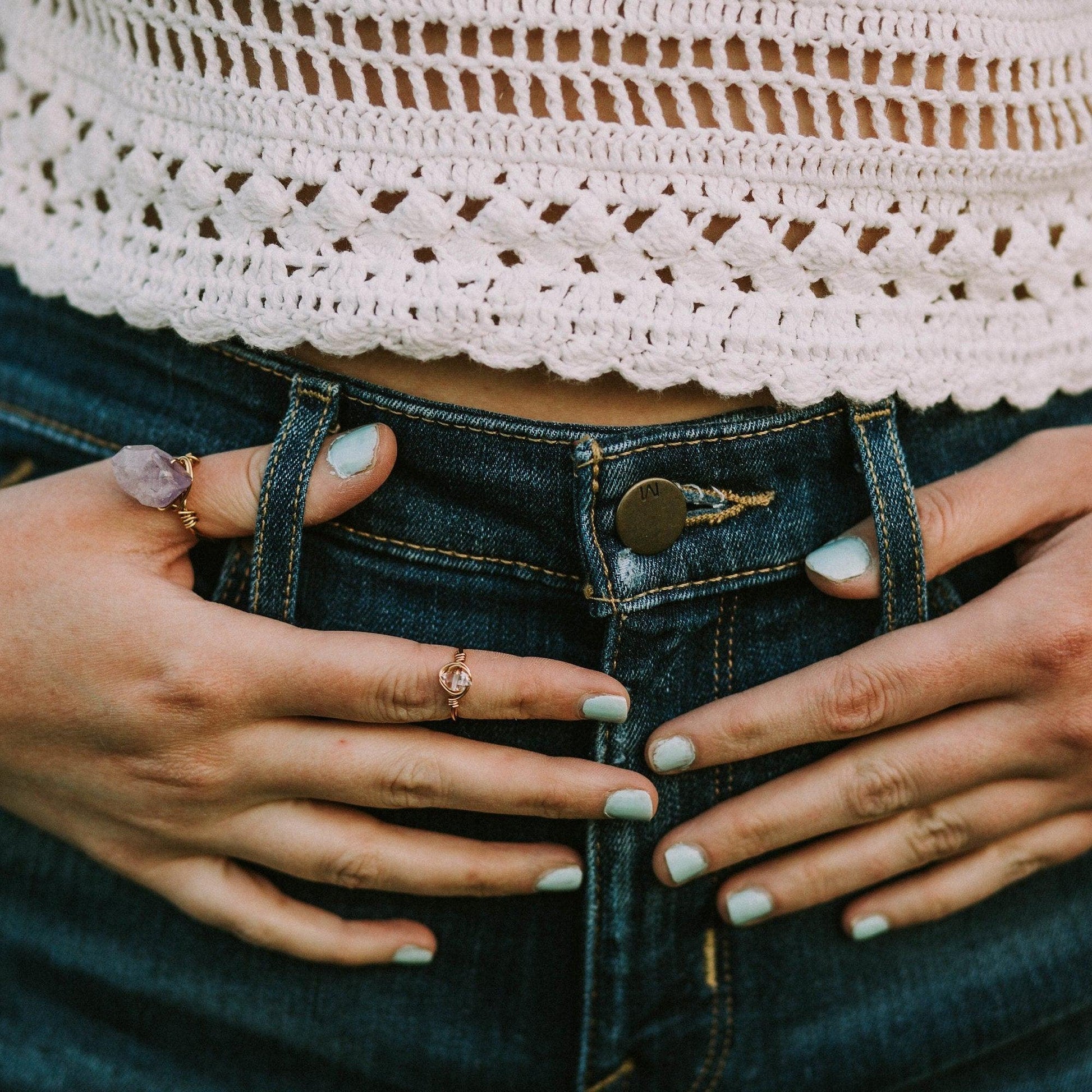 Get it for yourself if you're a February baby or gift it to the boho babe in your life who loves raw crystals! Whether you wear it for a cocktail party or as a cute little addition to your casual outfit, worn alone or stacked in multiples, this ring will hit the spot and turn heads wherever you go.