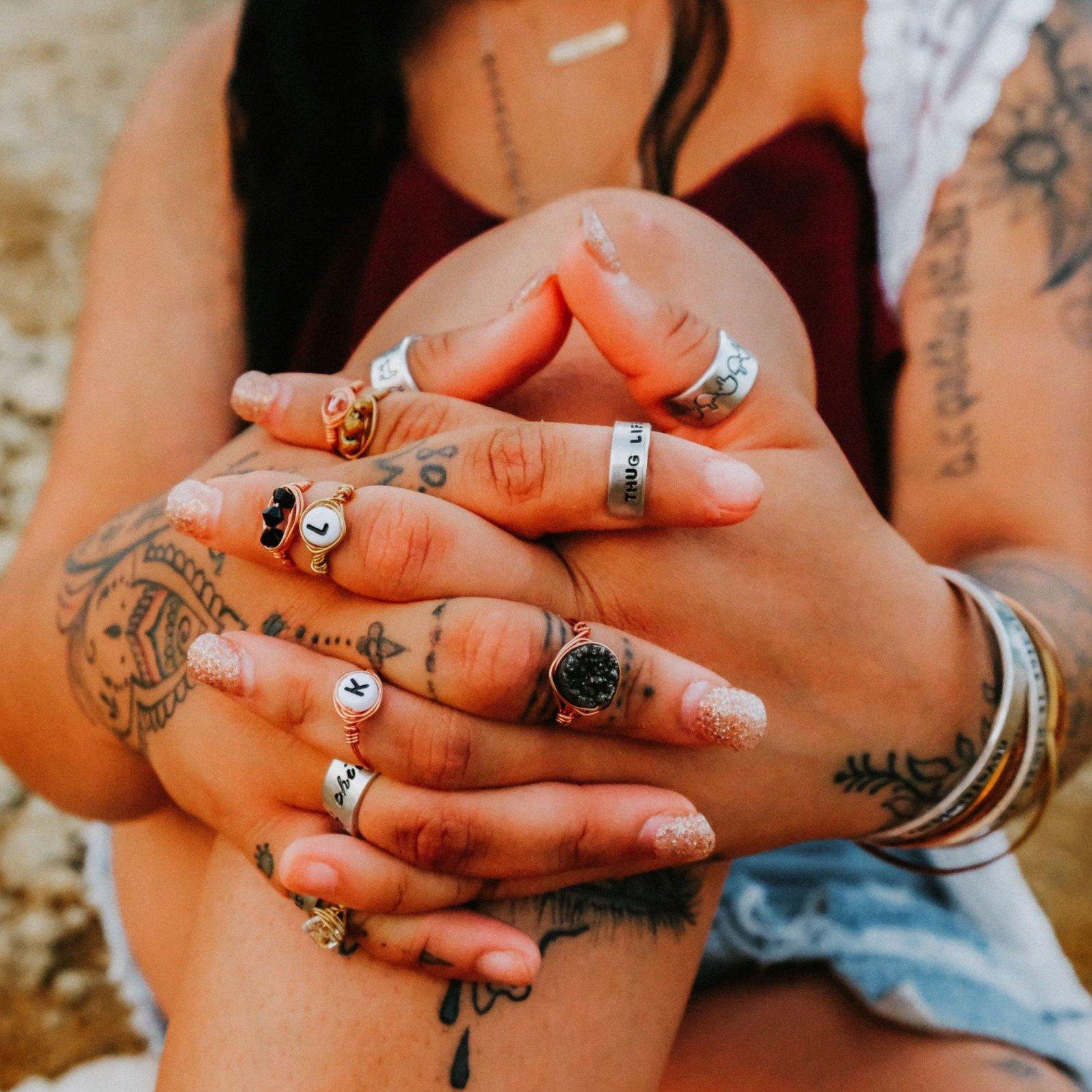 Imagine a ring that's uniquely yours, with your name or a special word hand-stamped onto it. The letters are carefully crafted with love, creating a whimsical and eye-catching design that's sure to turn heads. You can rock your own name, a funny nickname, or even an inside joke - it's all up to you!