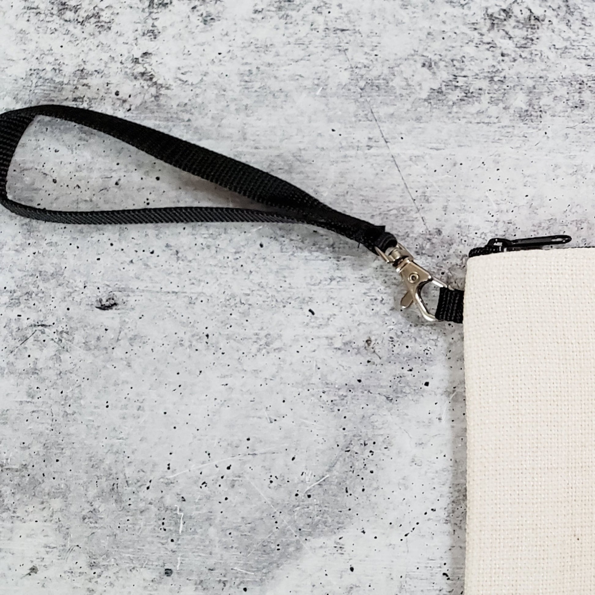• The hand sewn cosmetic bag measures approximately 9.5" x 6" with a black zipper and faux leather wristlet