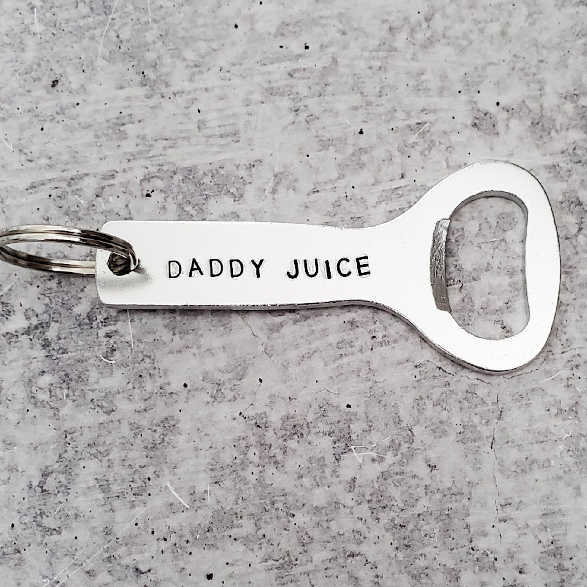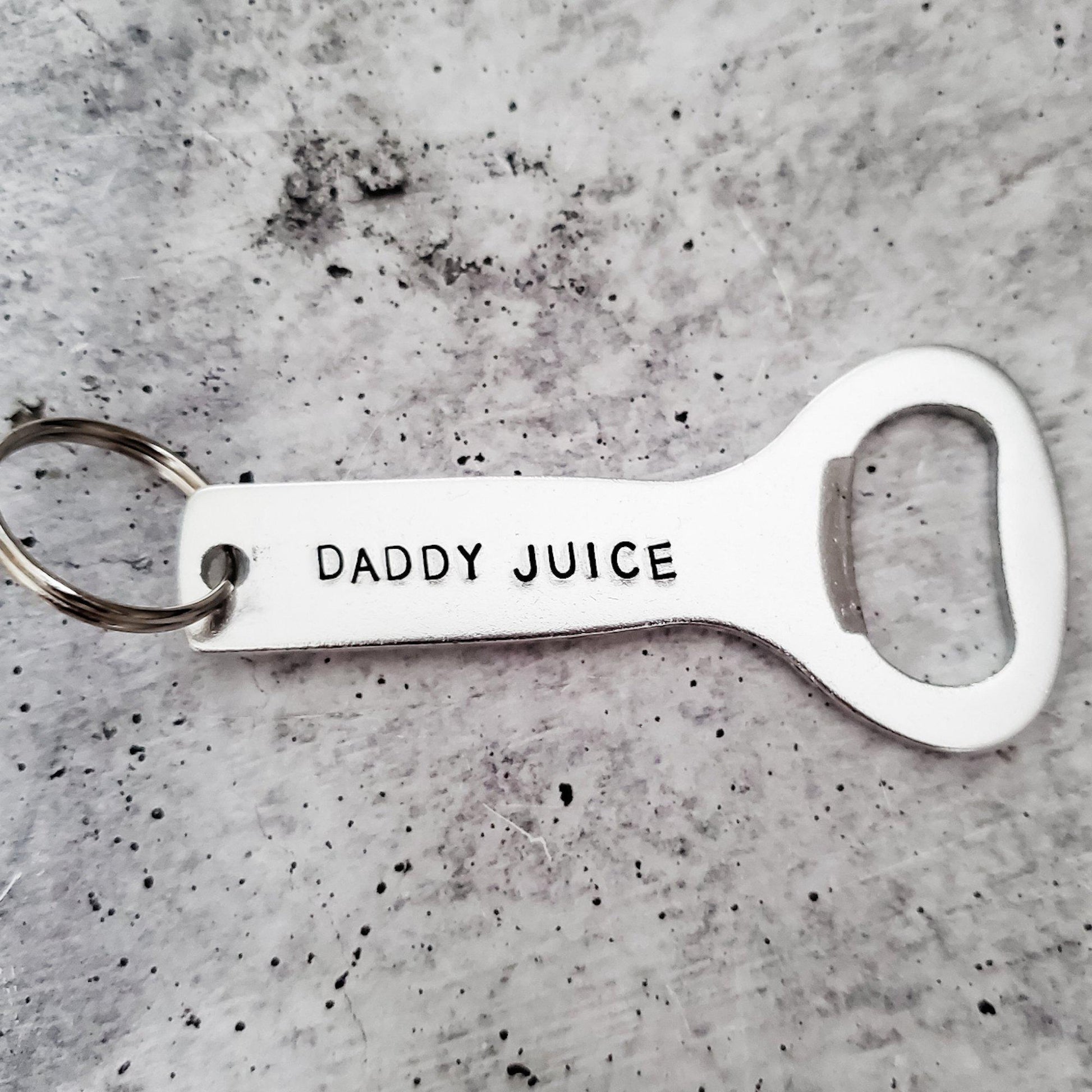 The text "DADDY JUICE" is hand-stamped in lowercase or uppercase letters of your choice on this sturdy aluminum beer bottle opener.
