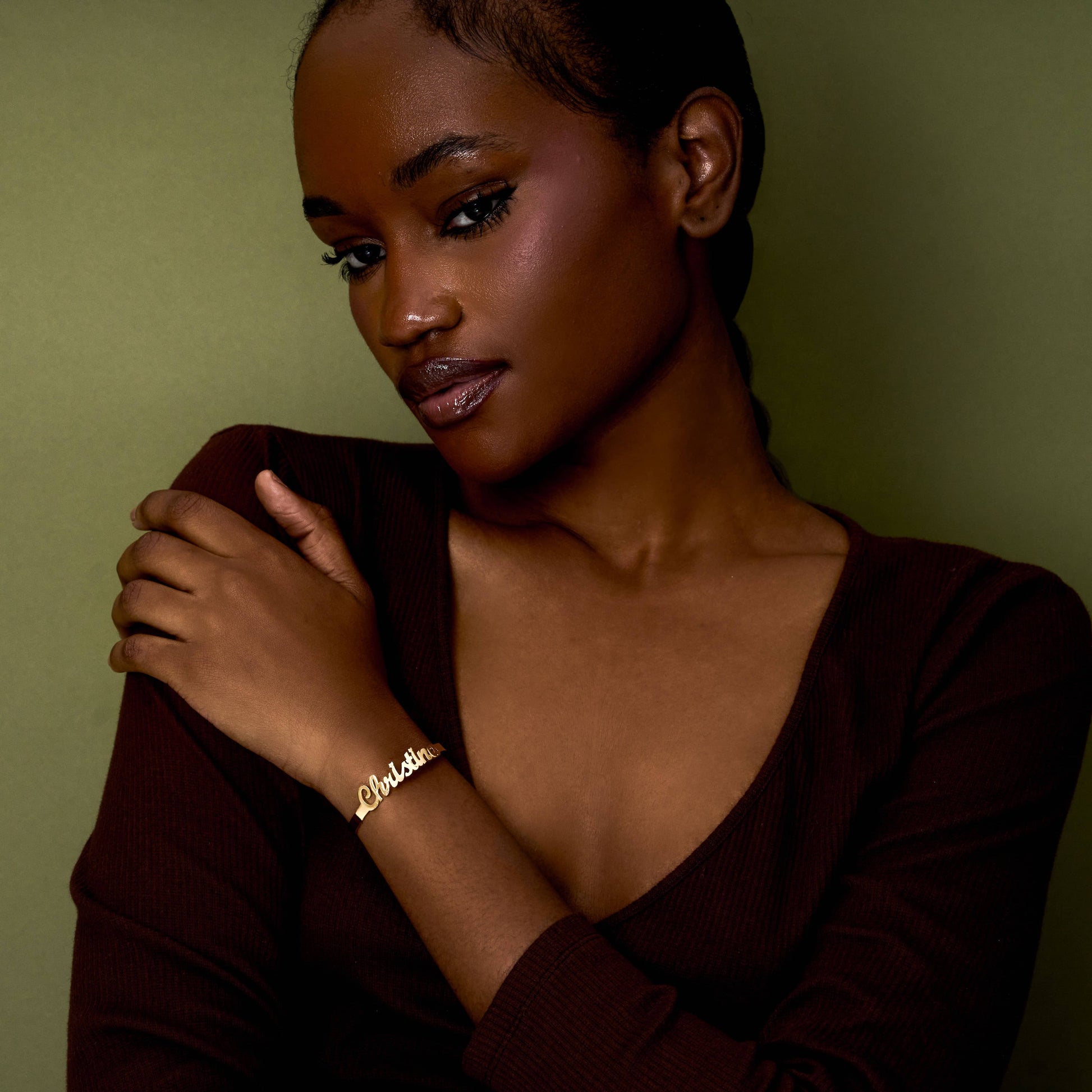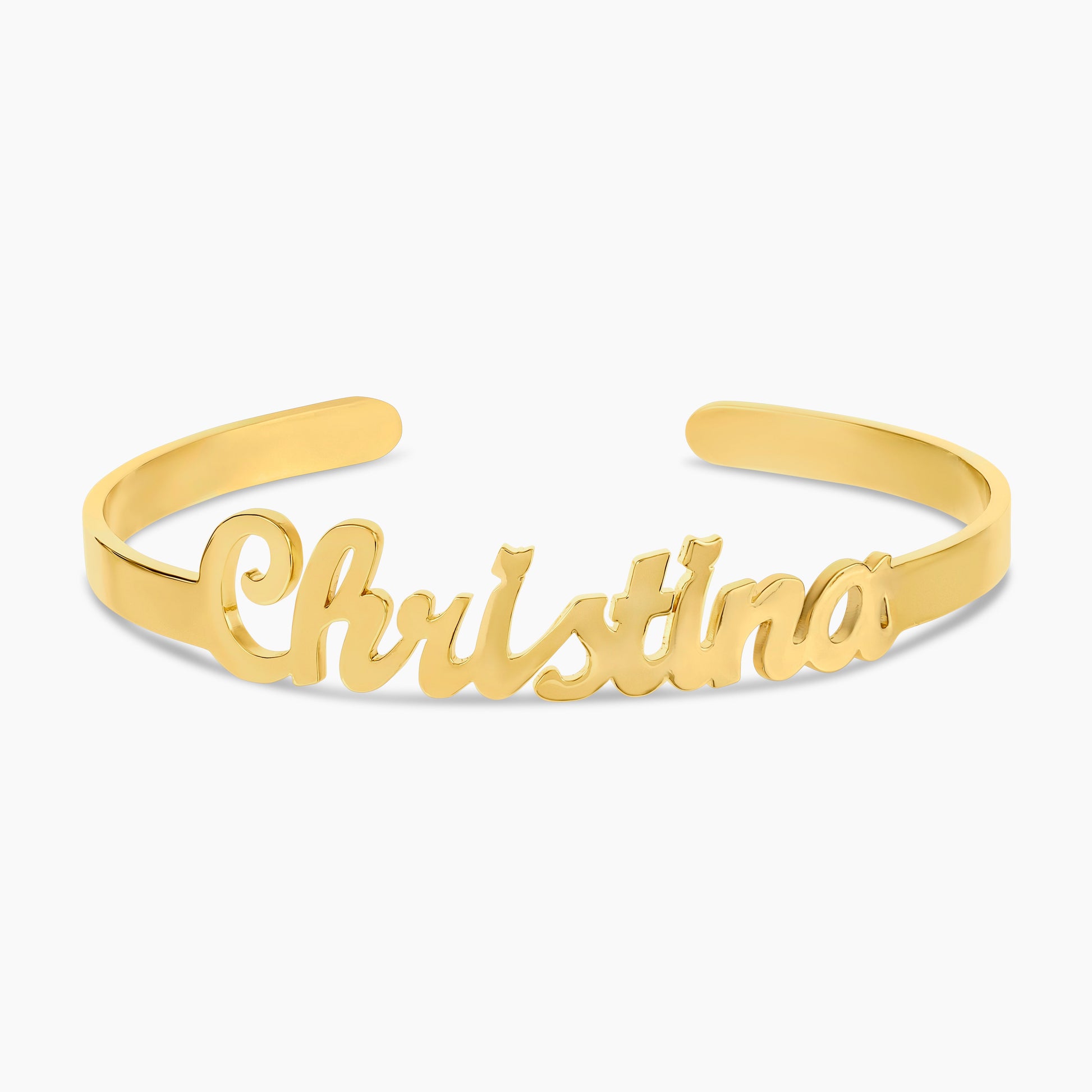 Refine your style with the Dainty Script Name Bangle, featuring a delicate script nameplate. Crafted from quality materials, it’s durable and comfortable, perfect solo or layered for a chic statement.