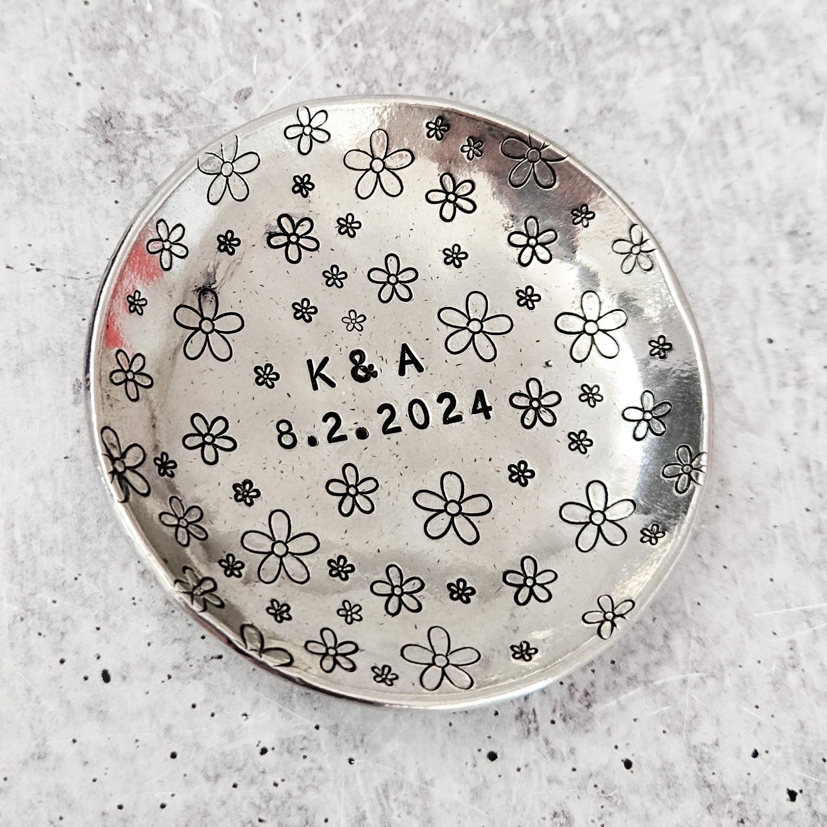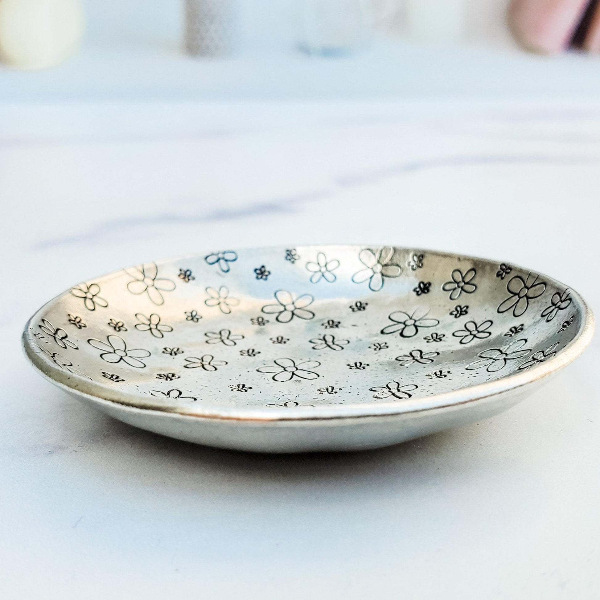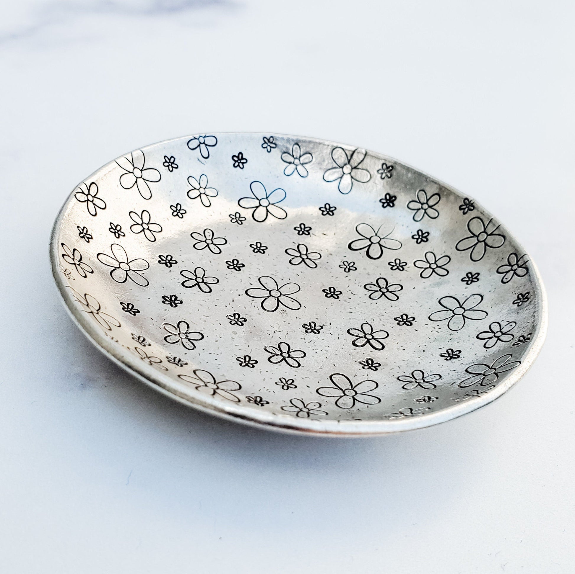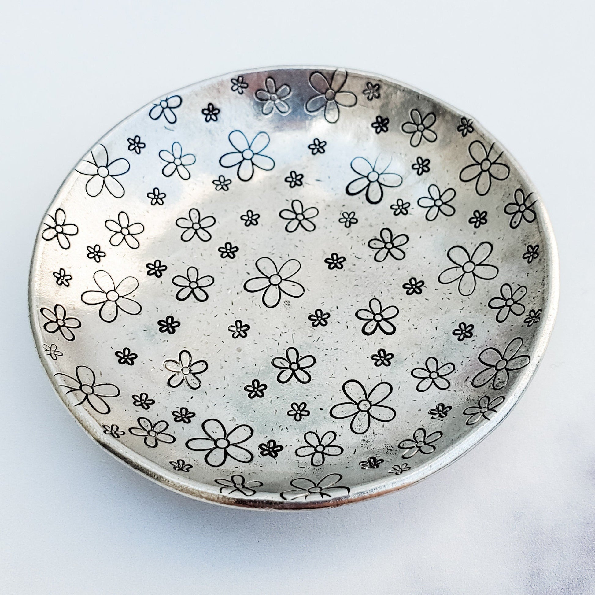 This hand-stamped and handcrafted pewter ring dish is the epitome of whimsical charm and personal flair. Picture a field of vibrant daisies dancing across the smooth surface, their petals shimmering with joy. Each blossom is meticulously imprinted by hand, ensuring a unique and playful touch that will bring a smile to your face every time you gaze upon it.