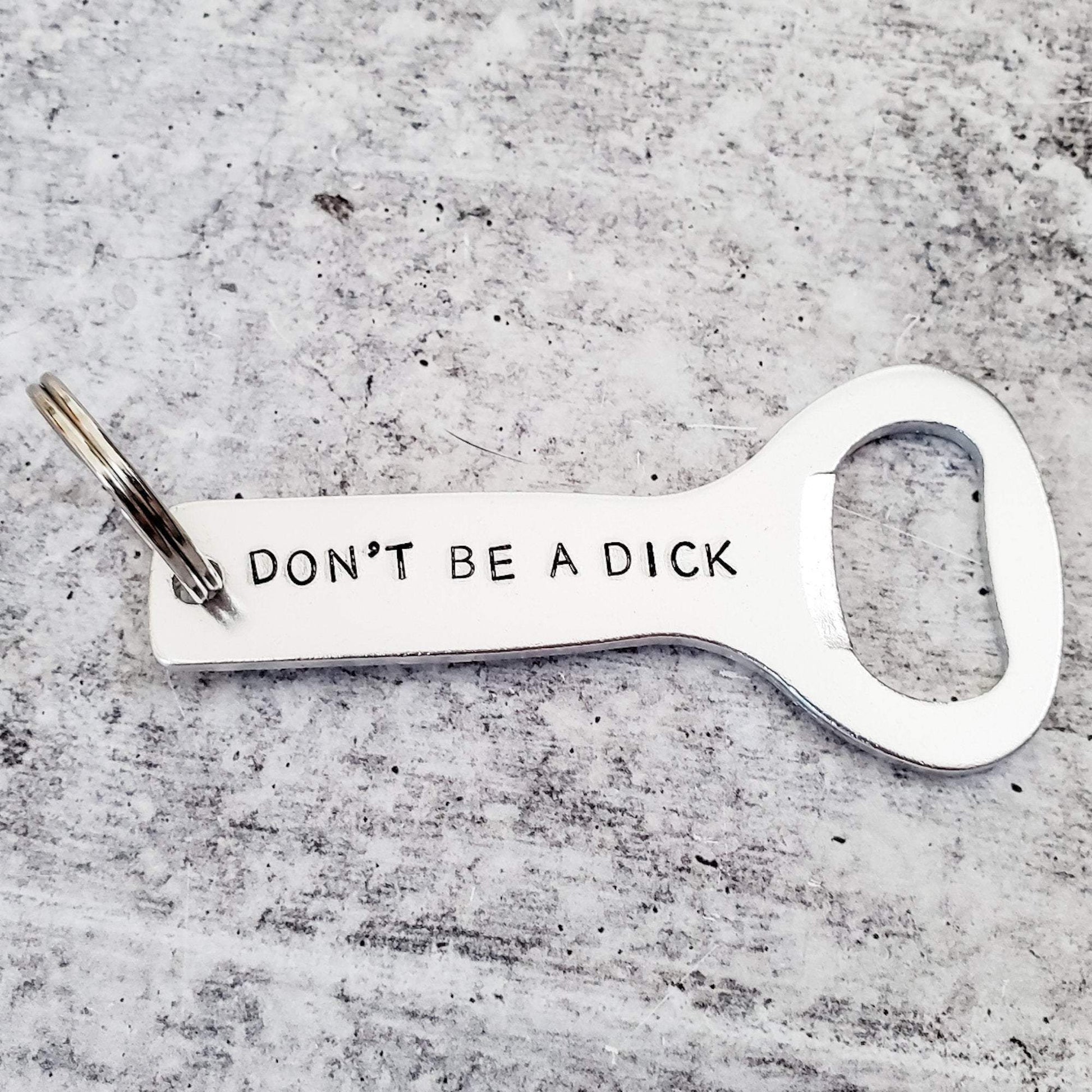 The text "DON'T BE A DICK" is hand-stamped in lowercase or uppercase letters of your choice on this sturdy aluminum beer bottle opener.