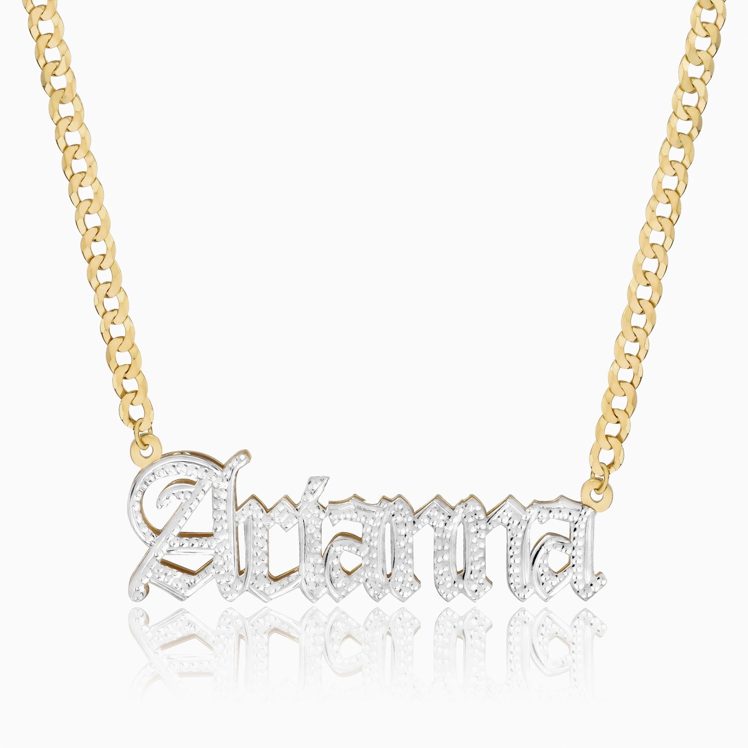Our popular Double Plated Gothic Name Necklace boasts a chic and elegant design, handcrafted to perfection. The model showcases the necklace with an 18-inch Cuban chain (see first slide for reference).
