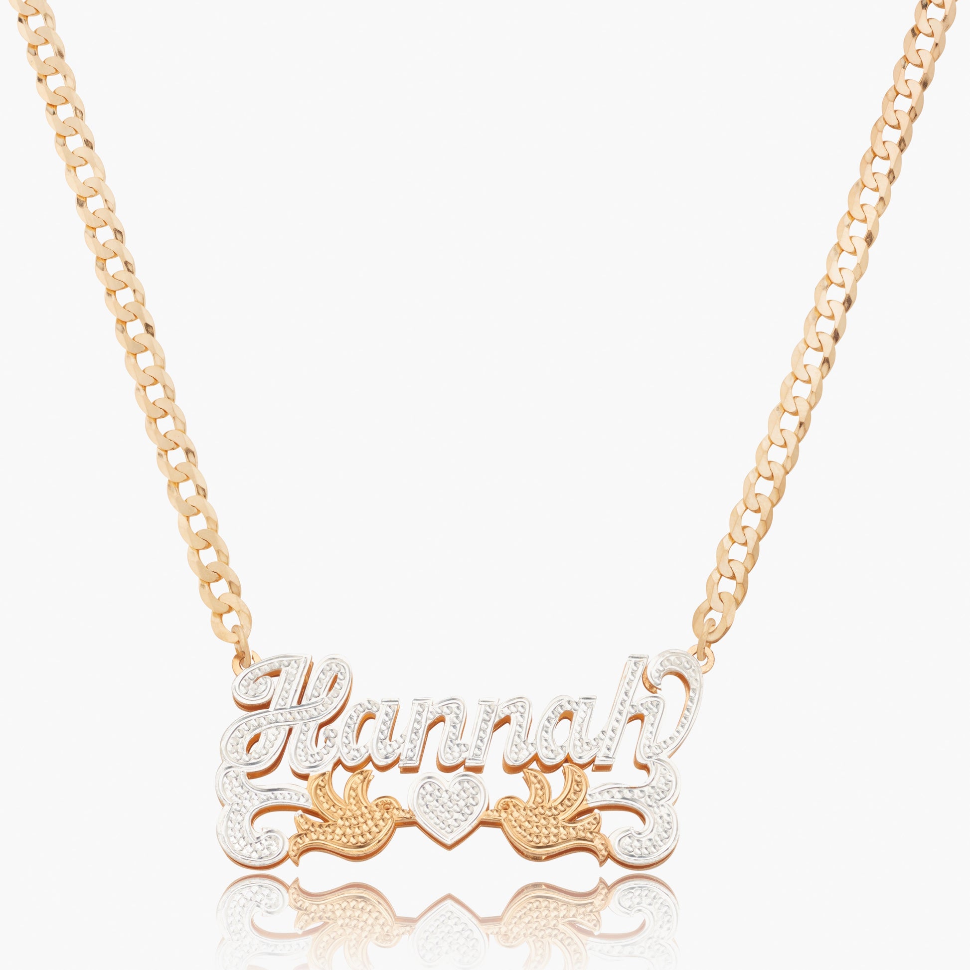 Our popular Double Plated Love Bird Name Necklace boasts a chic and elegant design, handcrafted to perfection. The model showcases the necklace with an 18-inch Cuban chain (see video for reference).