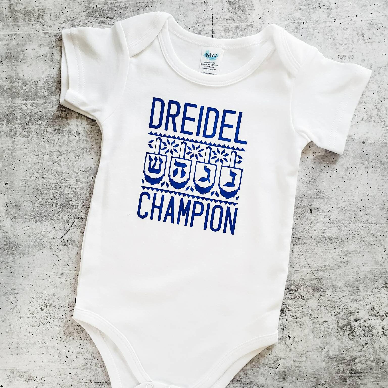 This short-sleeved baby one-piece OR toddler tee reads "Dreidel Champion" in a playful font with 4 dreidels as shown above. It's soft and cozy and fantastic for your little one to wear for any of the eight nights of Hanukkah. Gift it to the new baby, new mama, or new daddy in the family!