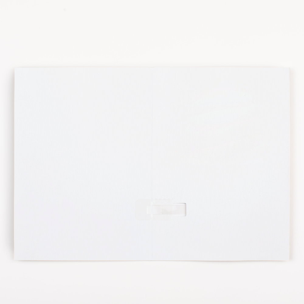 - Insert the card into the envelope; pull the tab from the spine to arm it.