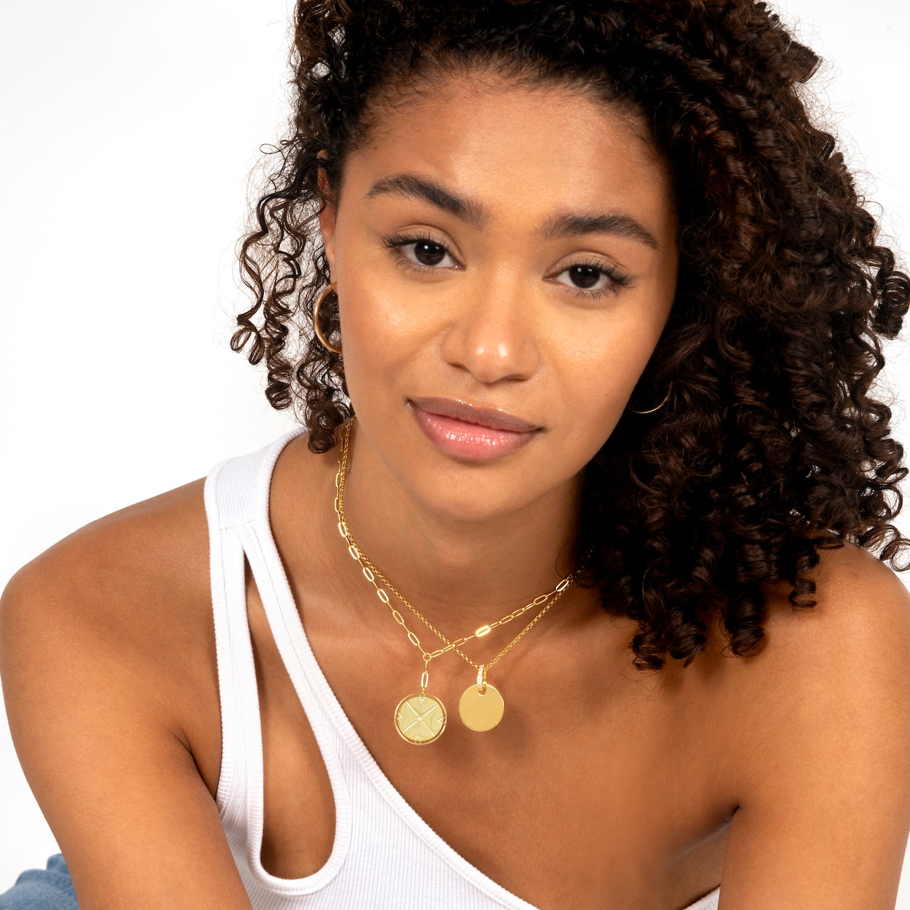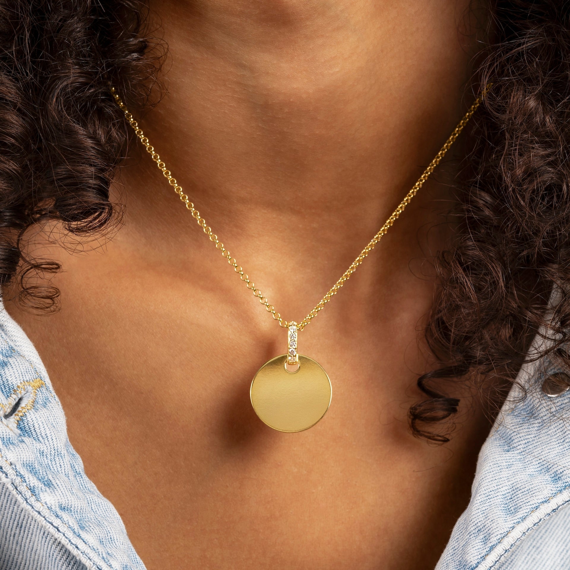 This playful circle necklace adds a touch of sparkle with an iced loop featuring cubic zirconia stones. The adjustable link chain (18" + 2" extender) and lobster clasp make it easy to wear. Choose from sterling silver or 14k gold over silver. And, get creative! This piece can be engraved with up to 8 letters.