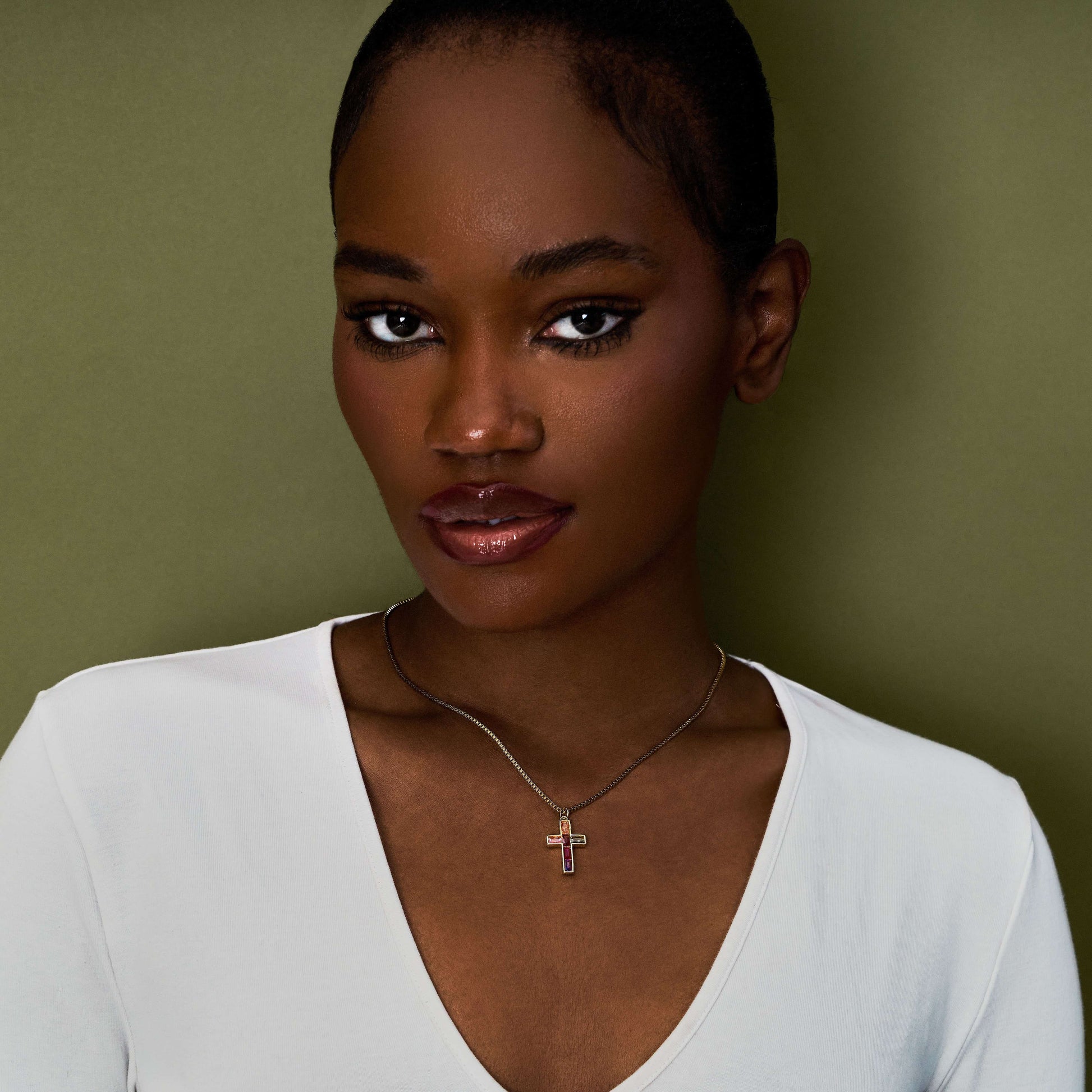 Brighten your style with the Fine Rainbow Cross Pendant. It features a sleek cross adorned with vibrant multi-colored CZ stones. Lightweight and durable, it’s perfect for everyday wear or layering.