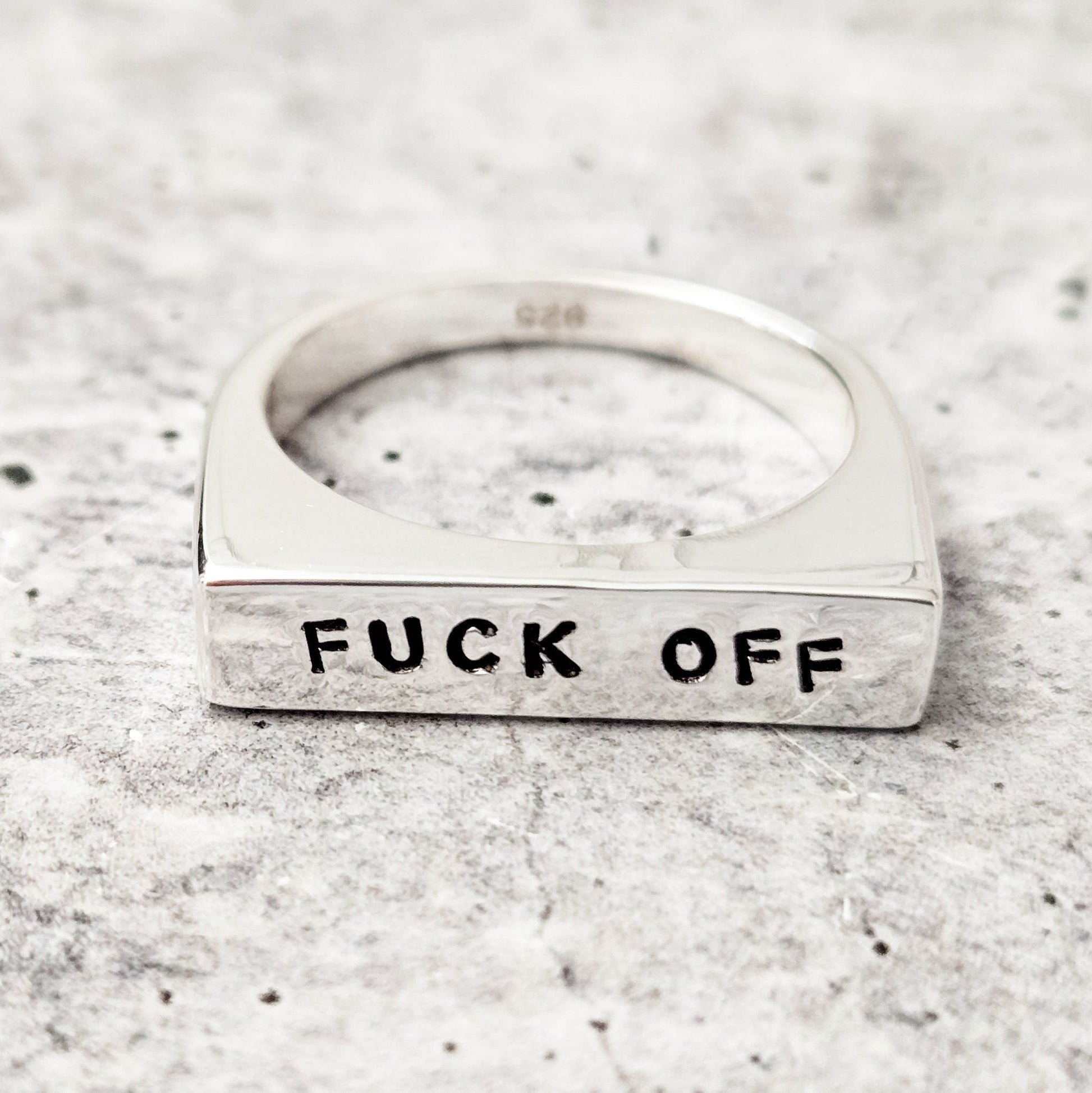 This ring is great to wear alone or stack in multiples to flip off anyone who needs a good middle finger "FUCK OFF."