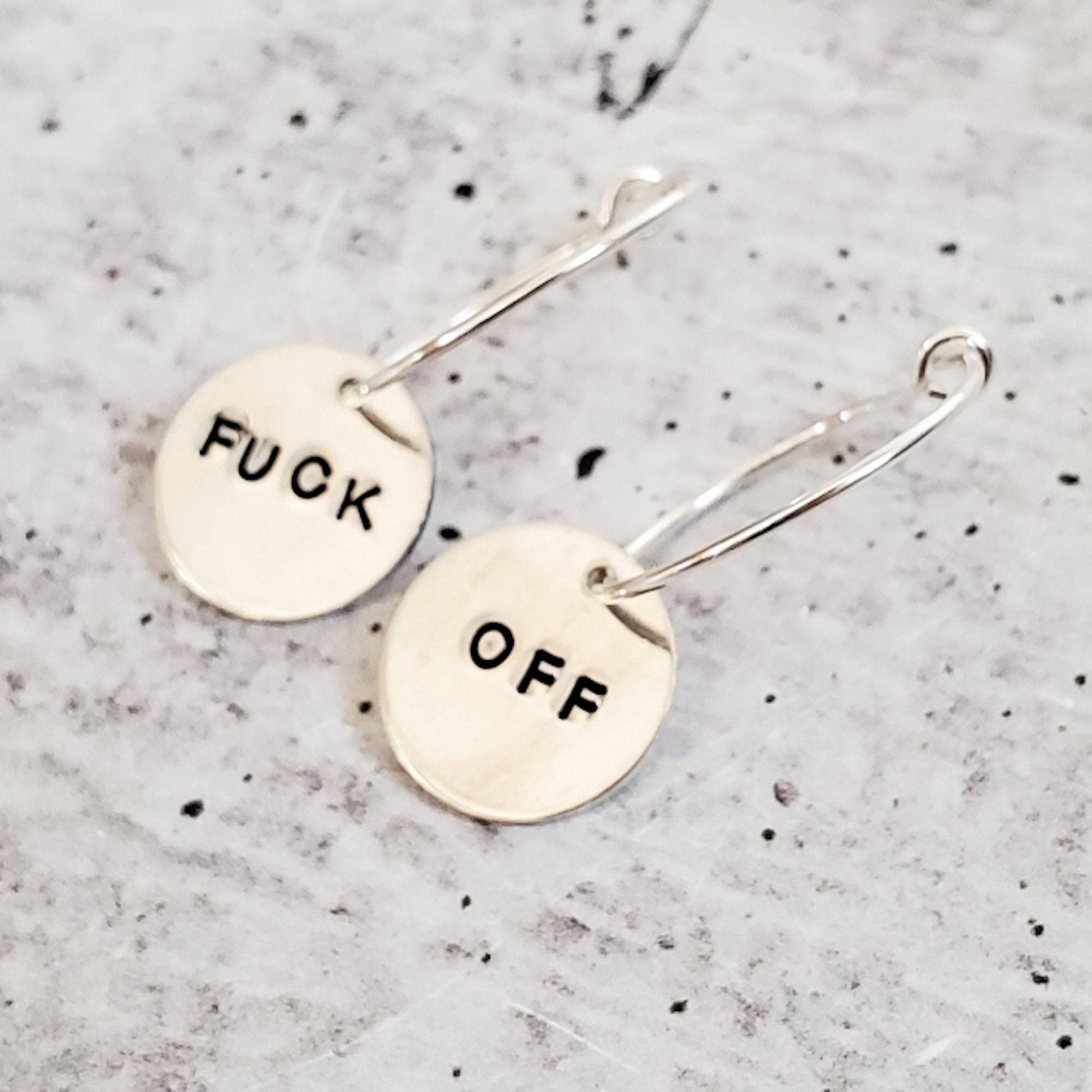 This is a beautiful and fun pair of dainty circle discs on small handmade wire hoops hand-stamped with "FUCK OFF" in vegan ink. It's an awesome piece of statement jewelry and makes a great gift for the friend with a sarcastic, no-filter sense of humor!