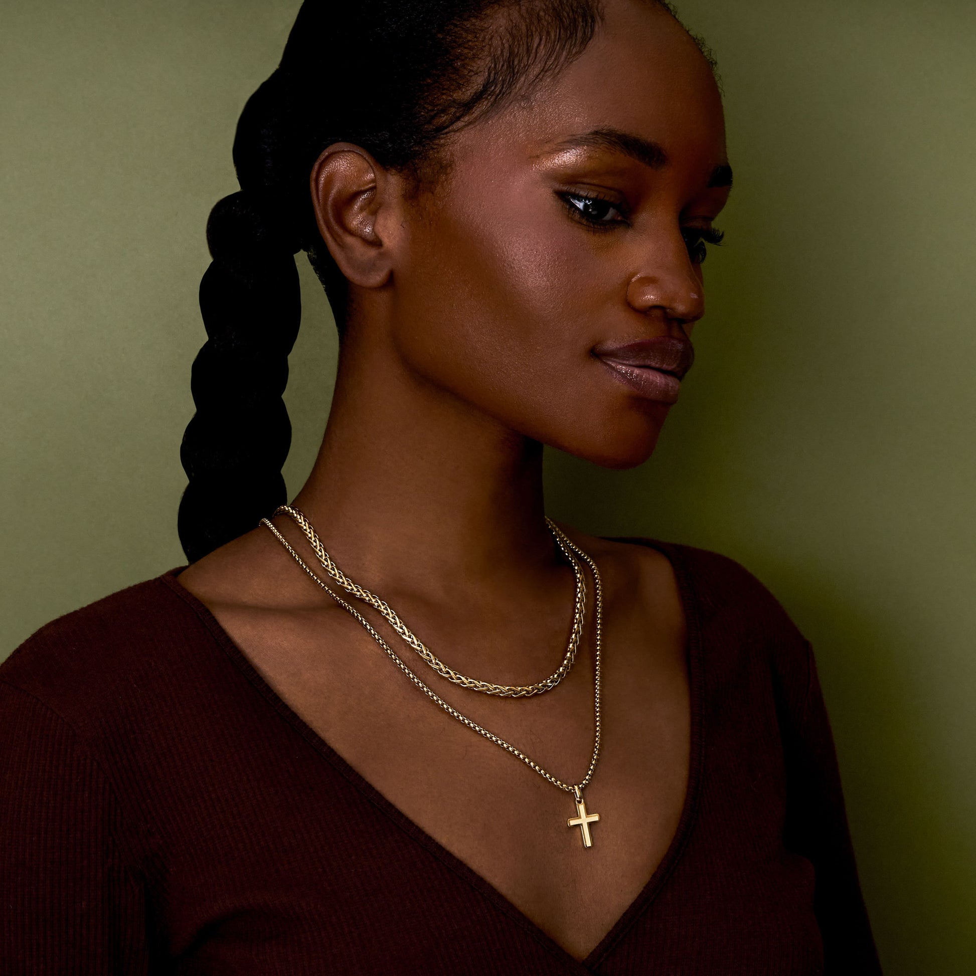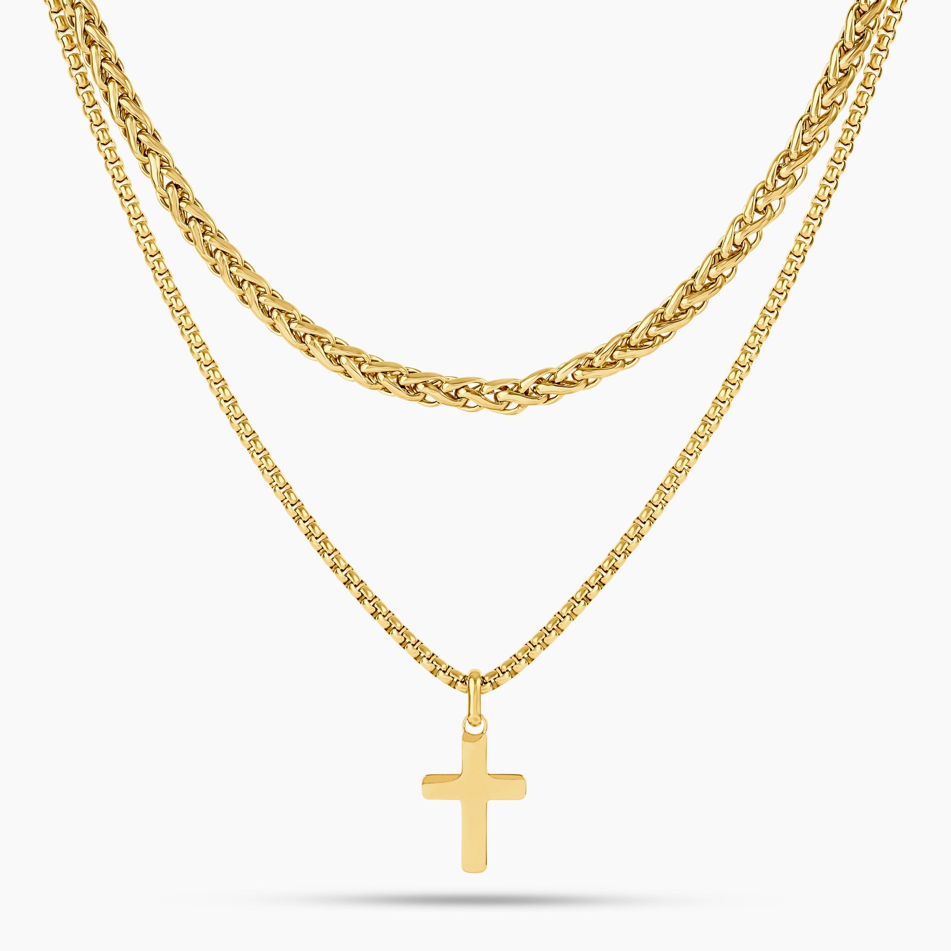 The Heavenly Layered Cross Pendant combines faith and elegance with two layered chains. A sleek box chain holds a cross pendant, while a delicate wheat chain adds texture. Perfect for any occasion.