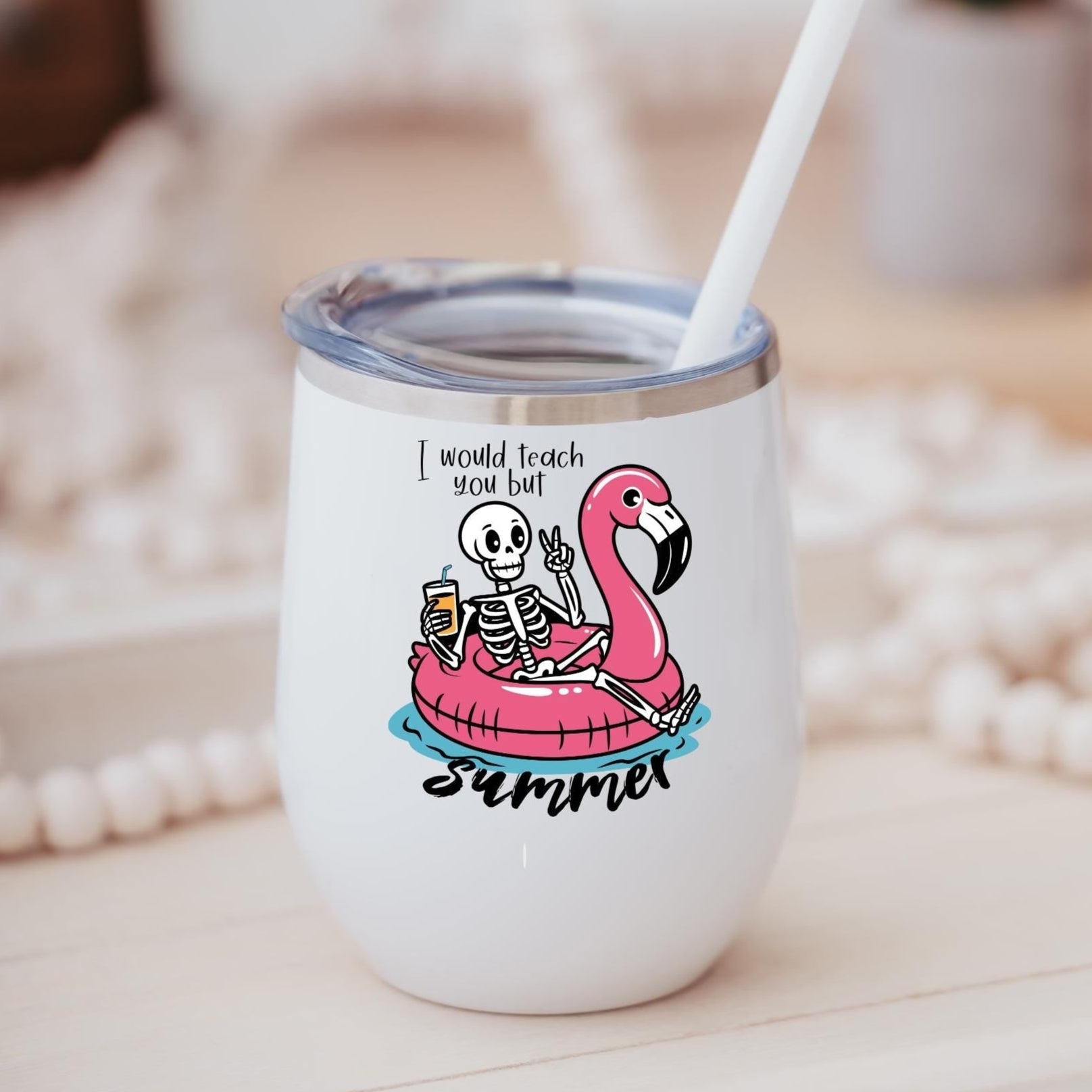 This 12 oz wine tumbler features a floating skeleton on a flamingo with the phrase I Would Teach You But Summer.