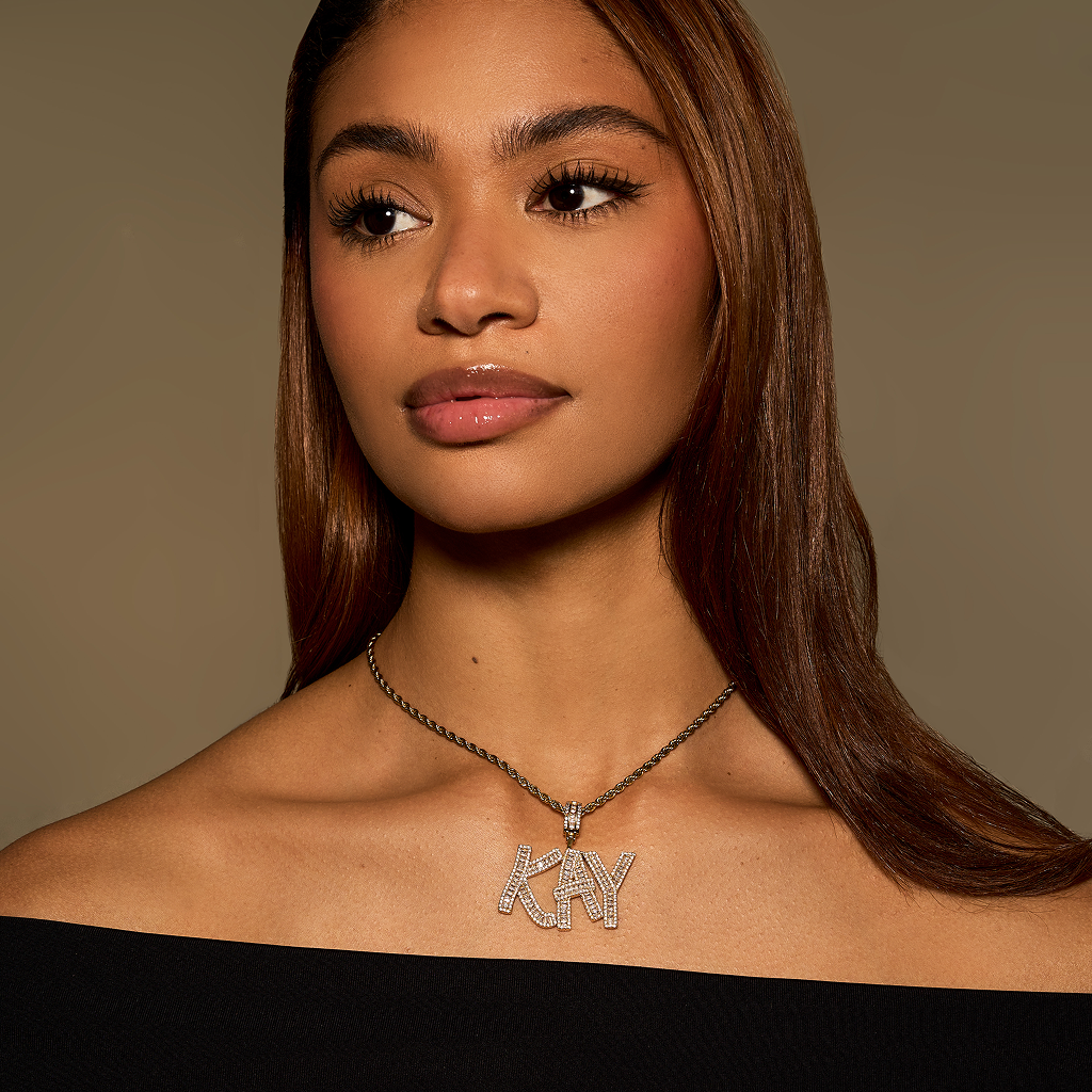 The Baguette Name Pendant shines with bold baguette-cut stones and a custom design. Paired with a matching chain, it is perfect for a standout look.