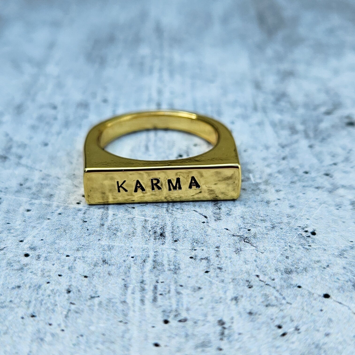 This is a flat top gold plated ring with 90's vibes that reads "KARMA" in cute uppercase font. It's great to wear alone or stacked in multiples. Get it for a cute subtle boost of motivation or gift it to the woman who inspires you to make the world better for all.