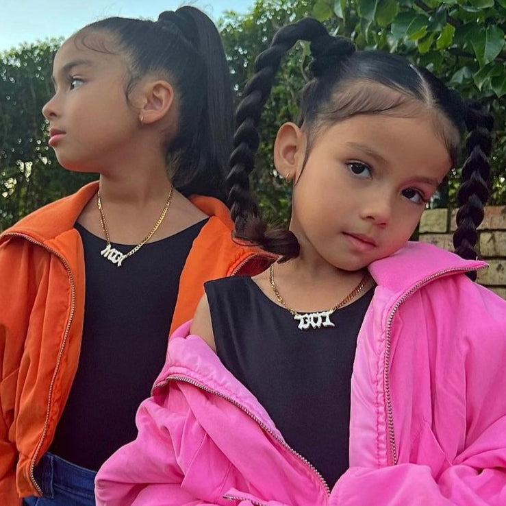 Our popular Double Plated TAKE-OUT Name Necklace boasts a chic and elegant design, handcrafted to perfection. The model showcases the necklace with a 16-inch Cuban chain (see video for reference).