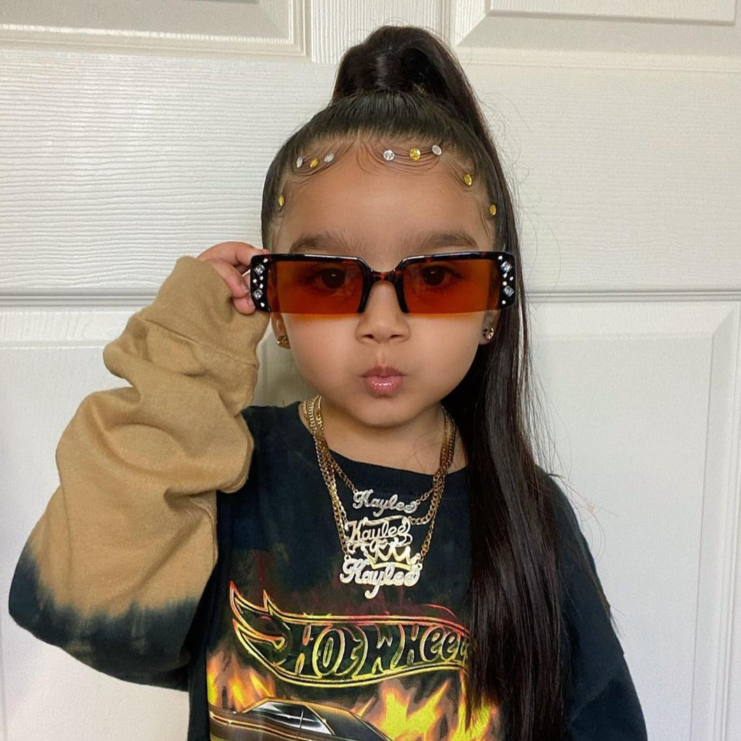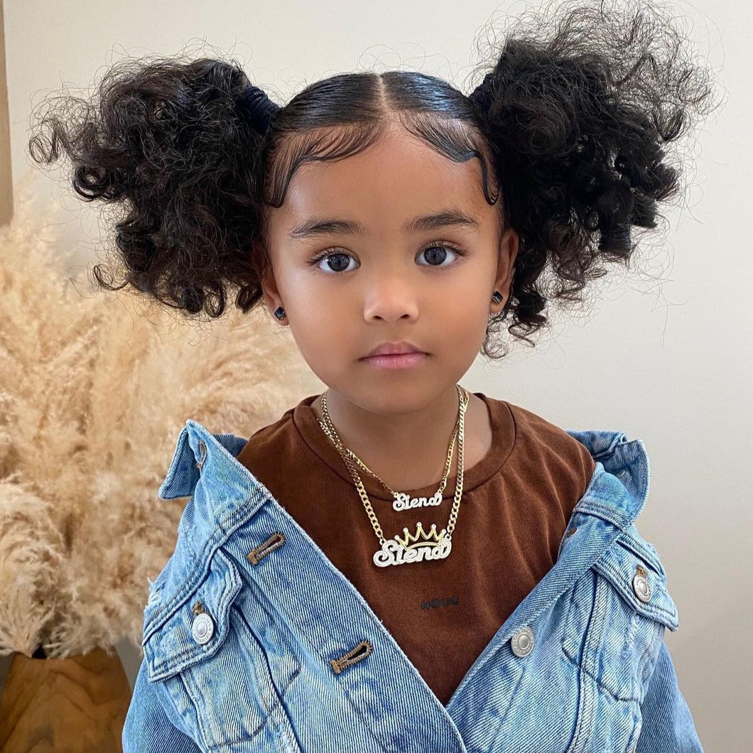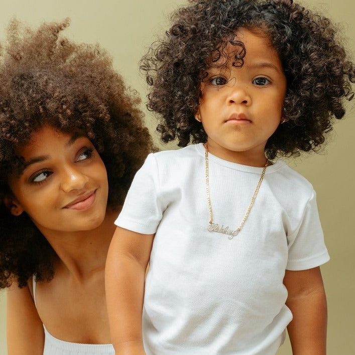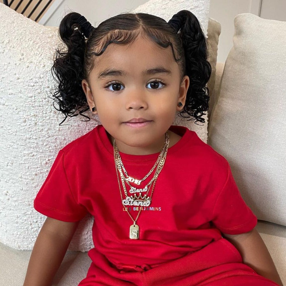 The child is 3 years old and is wearing a 16" inch, Figaro chain.