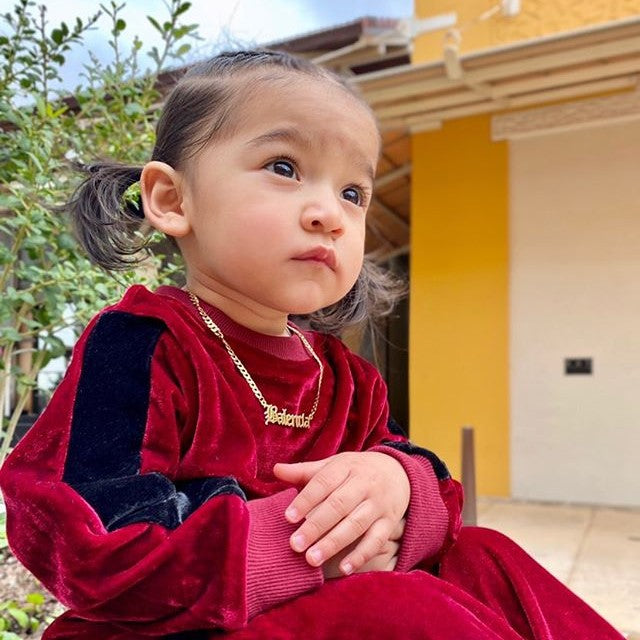 The child is 2 years old and is wearing a 14" inch, Cuban chain (refer to the first slide).