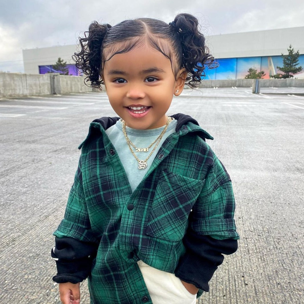 The child is 3 years old and is wearing a 14" inch, Figaro chain.