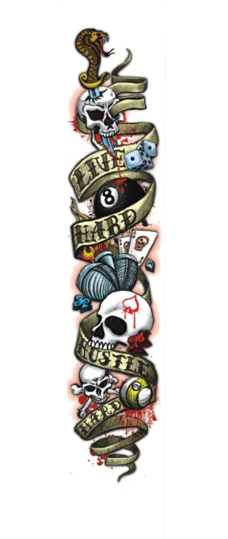 White forearm with tattoo-inspired Live Hard Hustle Hard design and a black back-end loaded rubberized grip with skull MZ Multi-Zone traction pattern, stainless steal joint collar and black slimline butt cap. Lifetime Guarantee even against warpage Made from 100% North American Grade A Hard Rock Maple Grip wrap with three distinct traction zones to handle any kind of shot you throw at it