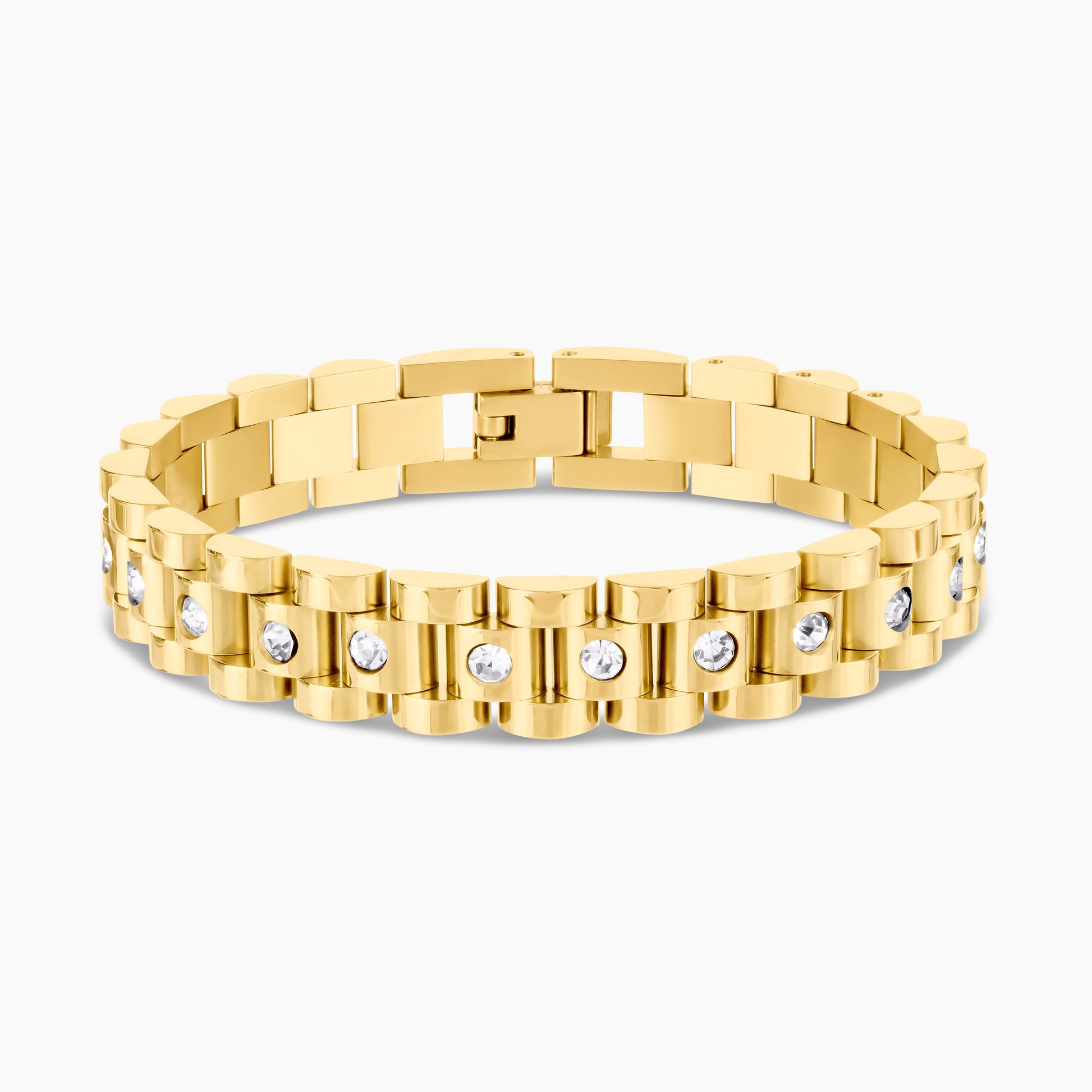 The Iced Out Jubilee Bracelet blends luxury and style with cubic zirconia stones that sparkle from every angle. Featuring a classic link design, it adds sophistication to any look. Durable and comfortable.