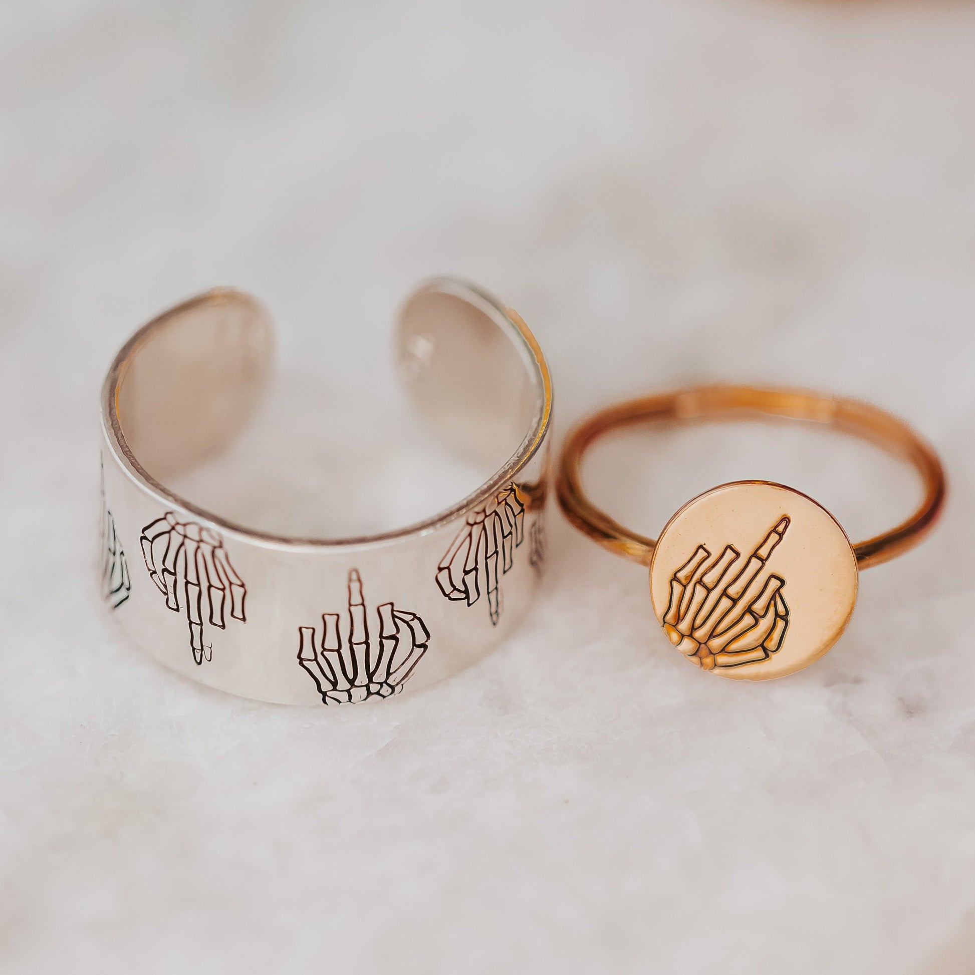 Add to your middle finger collection with this perfect SKELETON this Halloween. This simple single skeleton flipping you off on this handcrafted dainty ring is sure to make everyone howl with spooky delight!