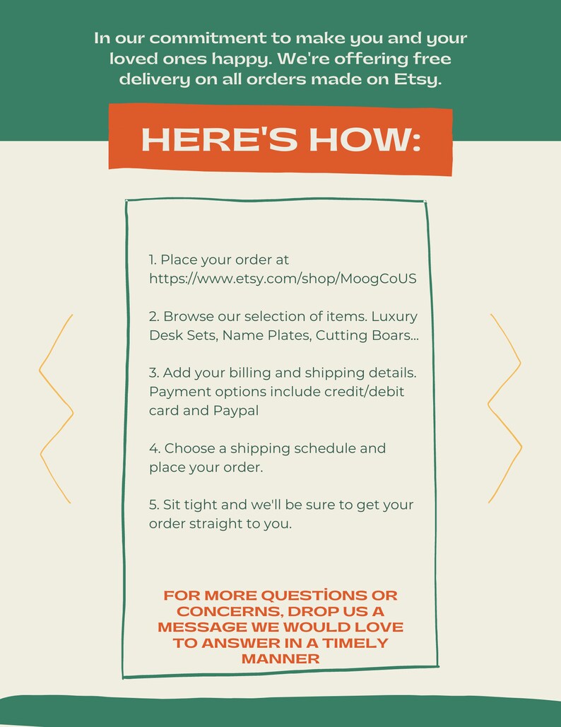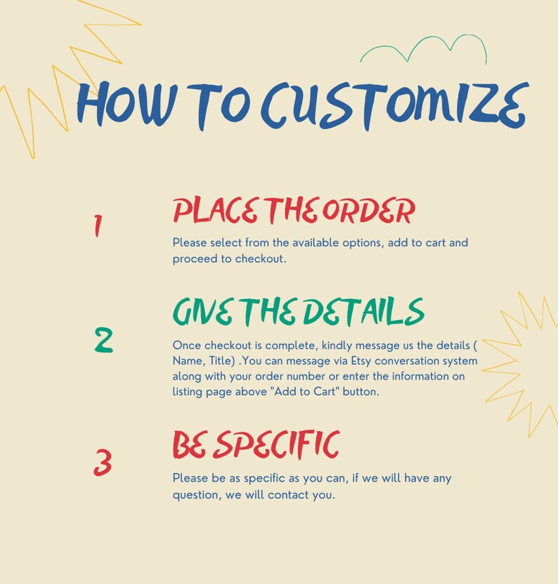 1-Please select from the available options, add to cart and proceed to checkout.2-Once checkout is complete, kindly message us the details ( Name, Title,) .3-You can message via Etsy conversation system along with your order numberPlease be as specific as you can, if we will have any question, we will contact you.Your order will be processed and shipped within 24 to 48 hours.All orders are shipped by UPS, Fedex or DHL with an online tracking number.If you have any questions, feel free to drop us a message and we will respond immediately!