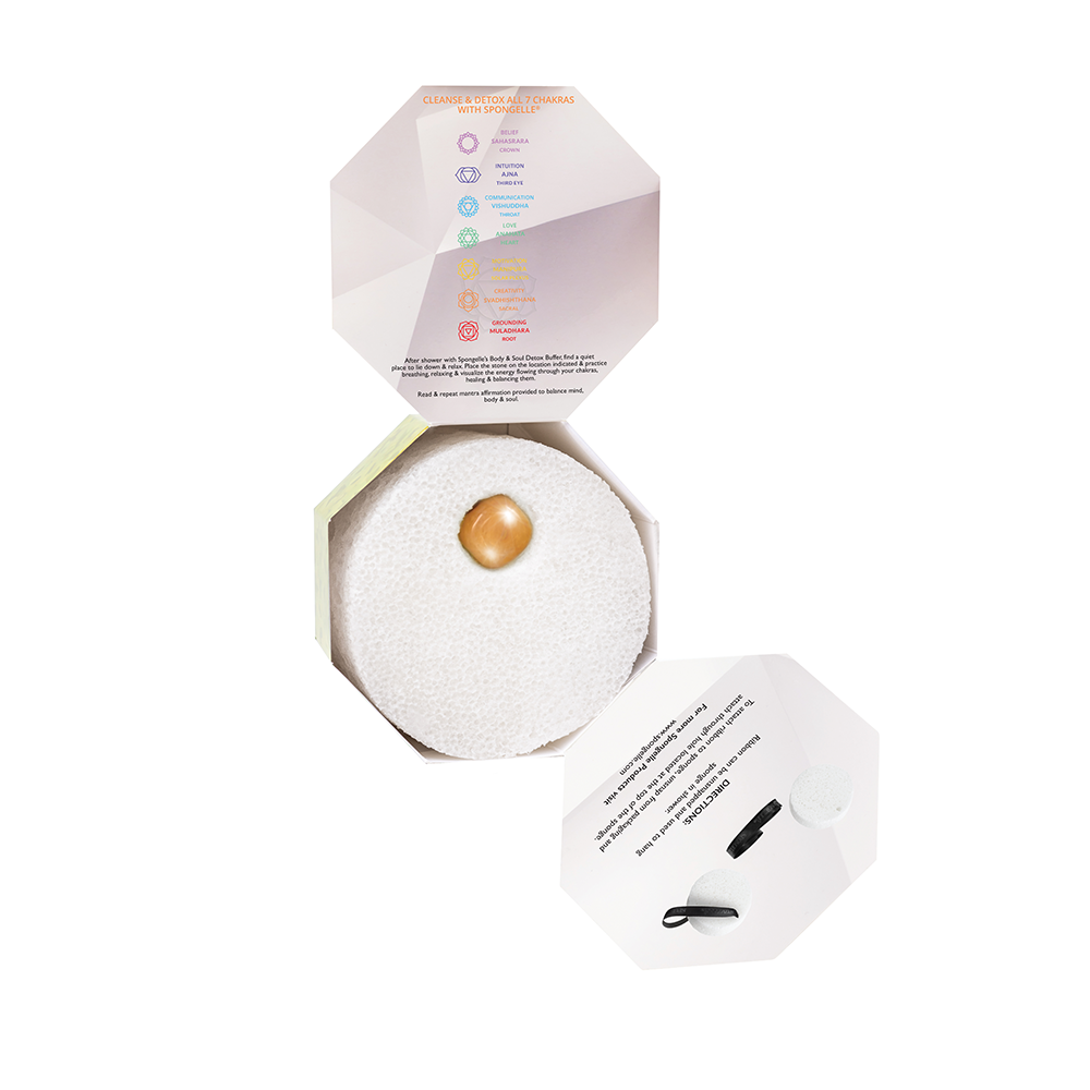 Nestle into a detoxifying and de-stressing cleansing experience with the Spiritual Detox Collection—complete with mood-enhancing Chakra Stone. Unleash Spongellé’s® creamy fragrance by placing the soft body wash-infused buffer under running water to reveal silky aromatic cleansing. Use the textured exfoliating side to gently polish away dead skin. Botanical science and patented technology ensures a minimum of 22+ washes.