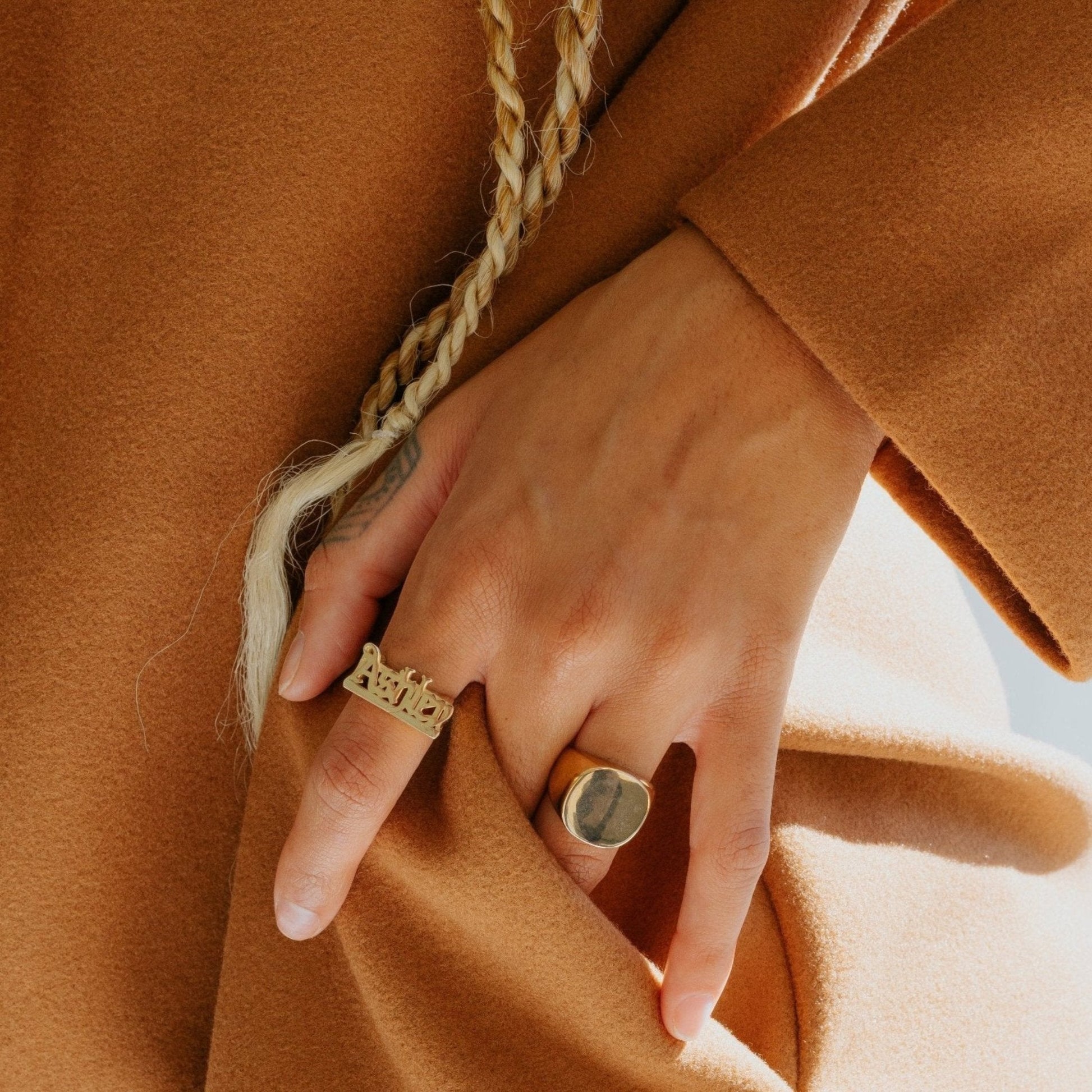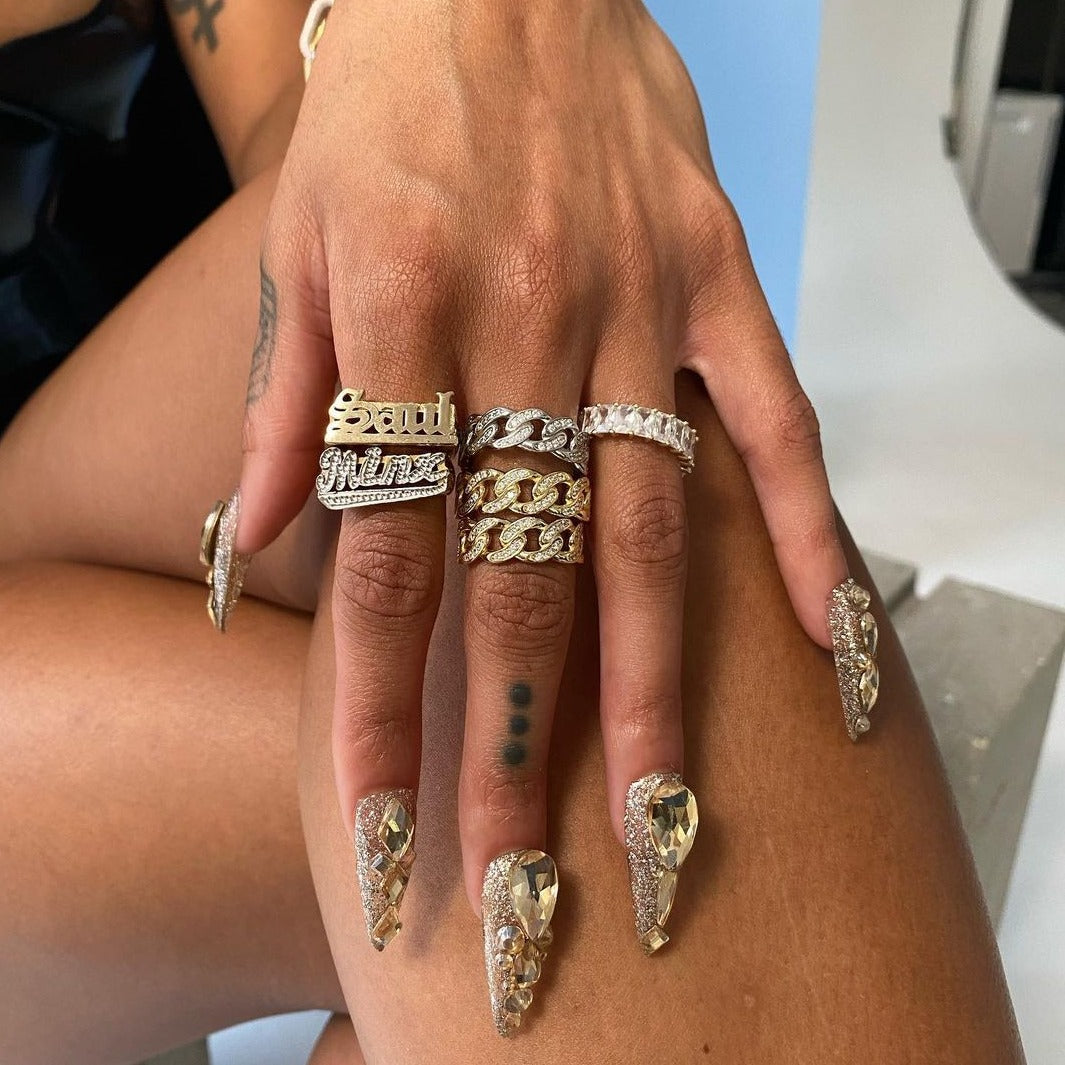 Enhance your style with our exquisite handcrafted Old English Name Ring. Customize it today to reflect your unique taste. Each ring is expertly crafted for you, featuring your chosen text in a distinctive Old English font. Customize your ring with up to 8 Letters, Numbers, or Roman Numerals. Select from ring sizes 4 to 14 for an ideal fit. Enhance your style with our exquisite Old English Name Ring, infusing a hint of uniqueness into your appearance.