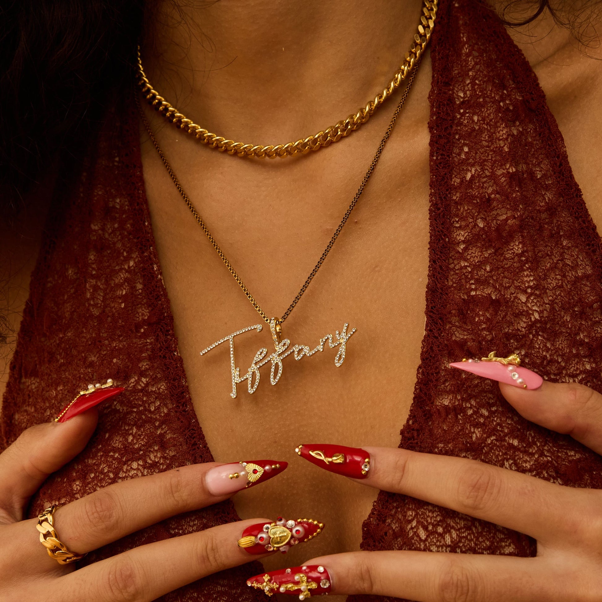 Shine in style with our Radiance Script Name Necklace – a dazzling custom piece crafted in elegant script and encrusted with sparkling stones for a glamorous, personalized touch.