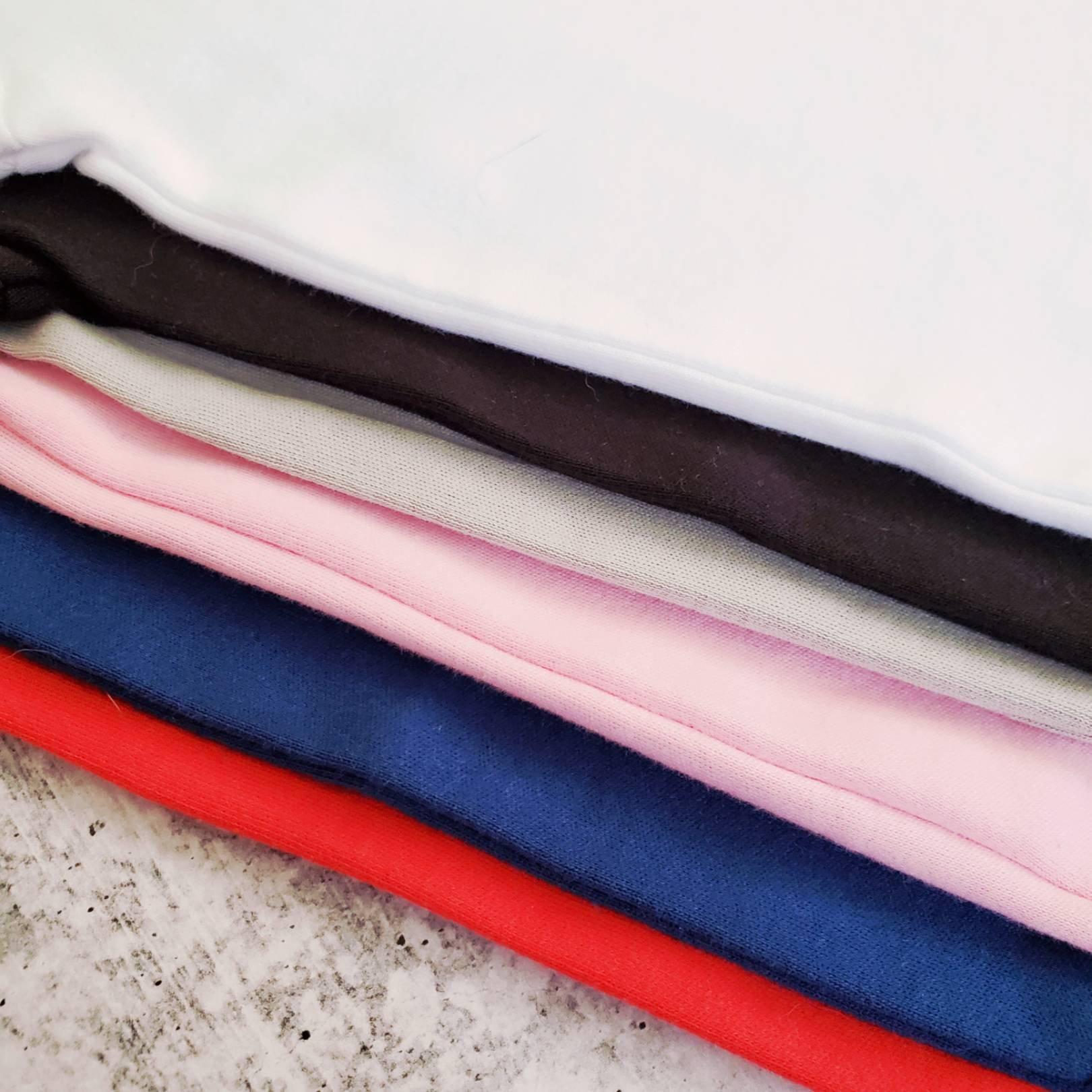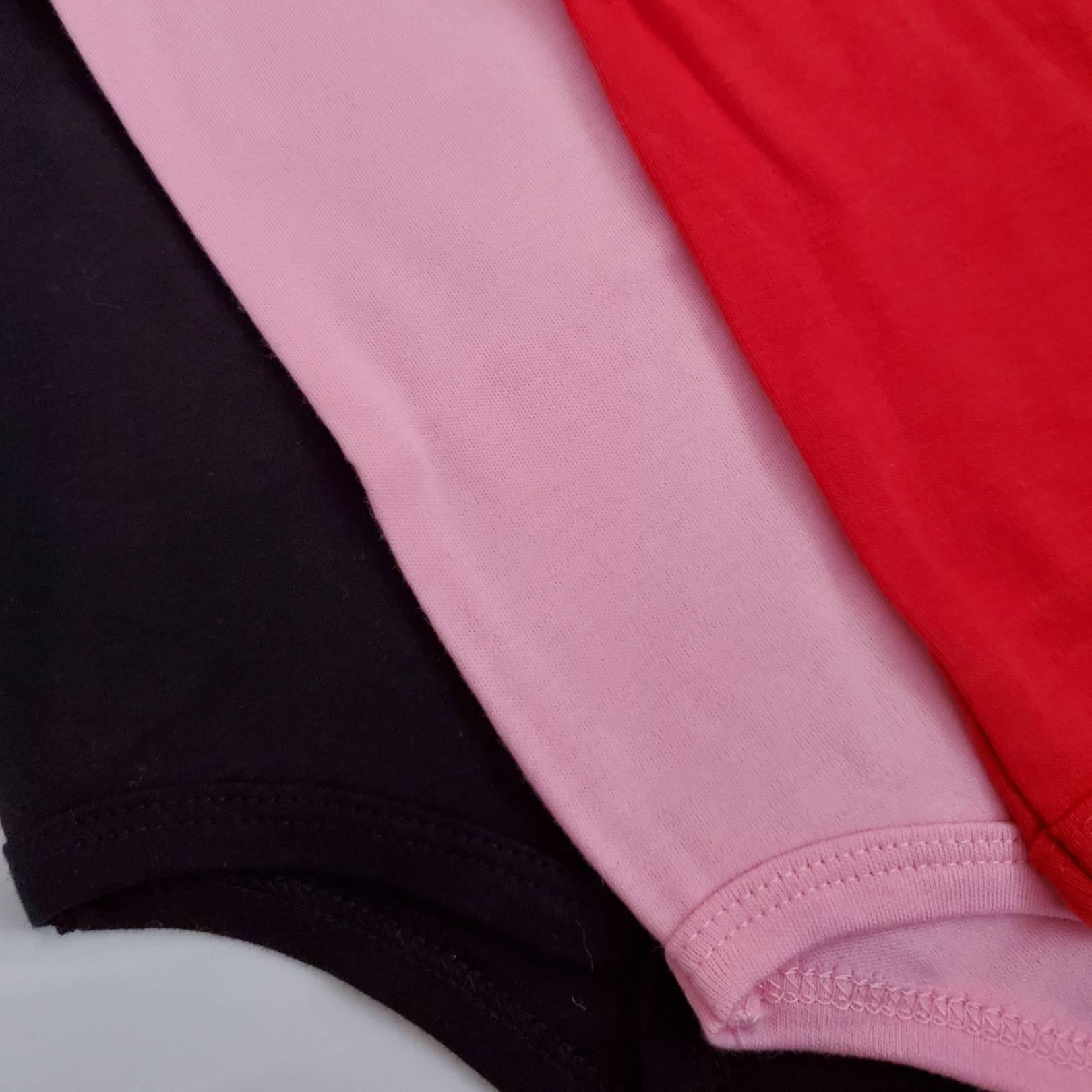 You can choose between a dark blue, bright red, real pink, black or a white bodysuit. Model is 10.5 months, 23 lbs and in size 6-12.