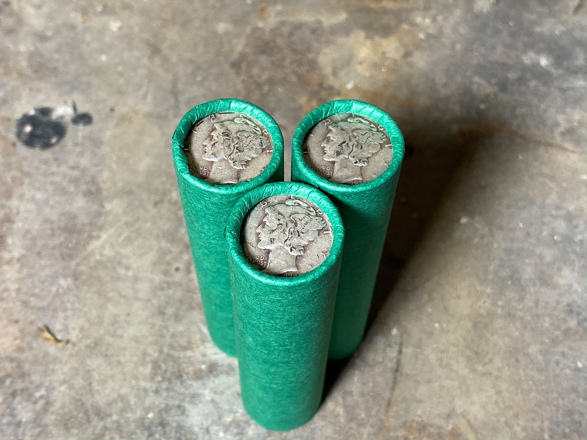 SILVER MERCURY DIME showing on vintage unsearched old green wheat penny roll us coins estate collection cent sale pennies lot hoard