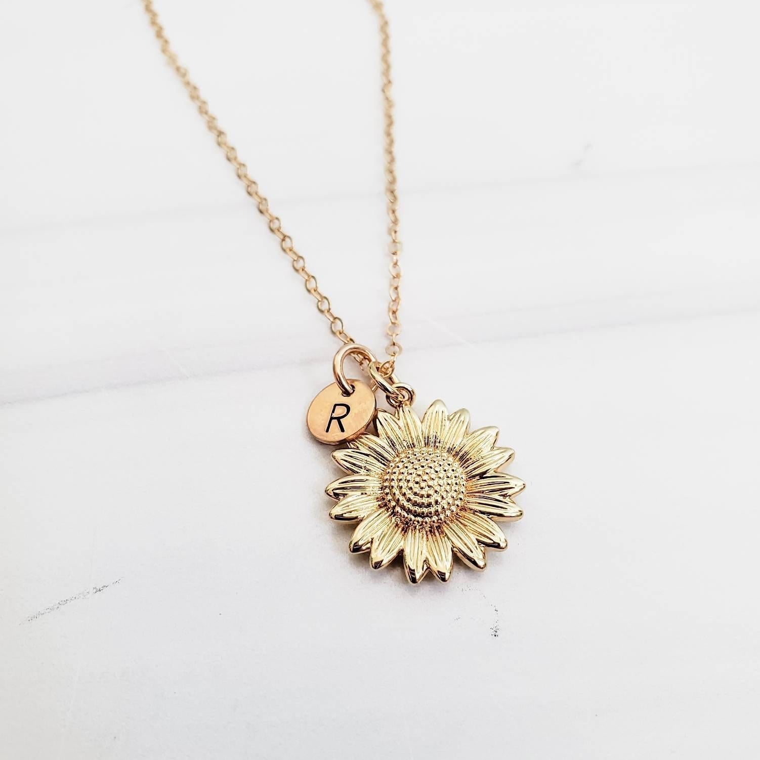 - A textured and lovely sunflower charm necklace that comes plated in gold or silver stainless steel with a 14k gold filled or sterling silver chain.