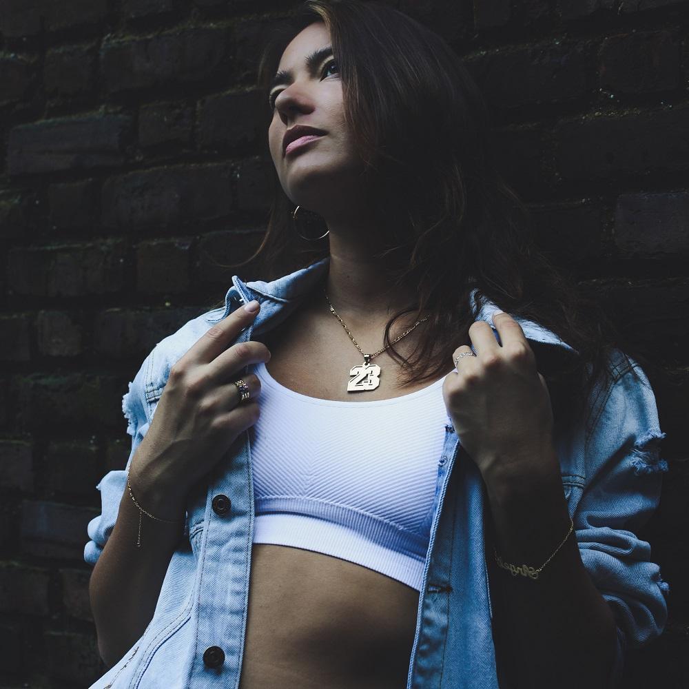 Model is wearing an 20" inch, figaro chain (refer to first slide)