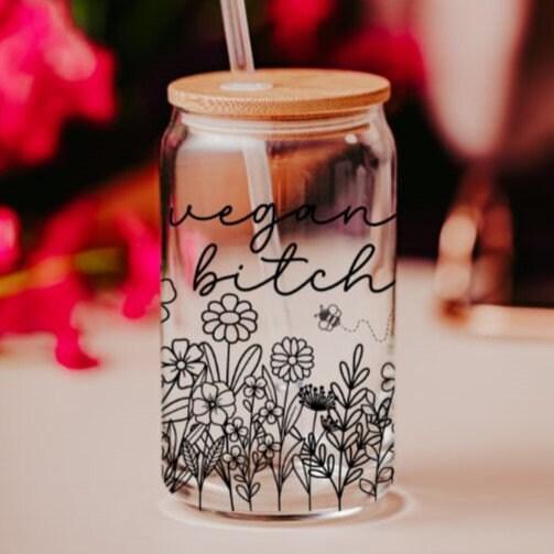 This gorgeous glass can cup is printed black wildflowers, bees and discreet script text that reads "vegan bitch" which really needs no explanation!!