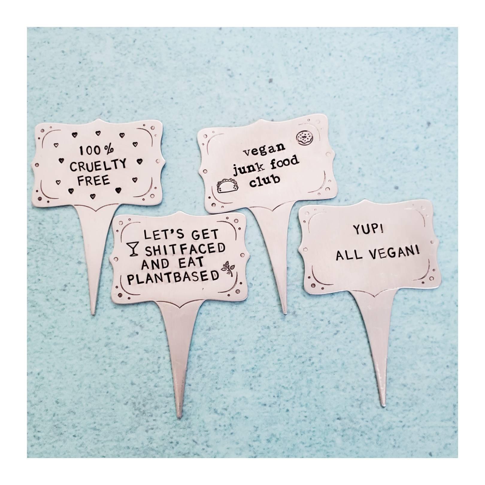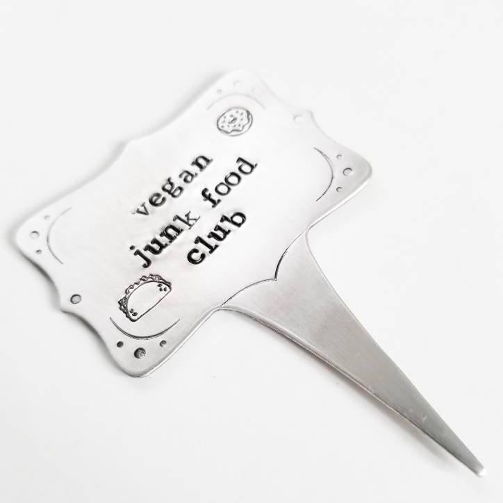 This is a small aluminum food marker sign hand-stamped with a vegan (or not vegan!) phrase of your choice. This is perfect for your plant-based, cruelty-free food party, special lunch, holiday dinner, engagement party - you name it! Your vegan charcuterie board needs these!